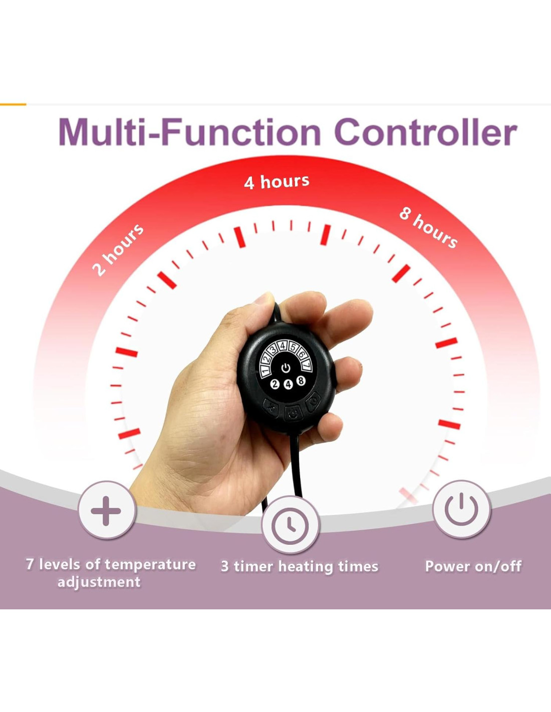 - 7 Botones de Ajuste de Temperatura - Presiona el interruptor de encendido y usa el botón "+" para ajustar la temperatura adecuada. El 1er nivel calienta aproximadamente 3C, el 2 nivel calienta aproximadamente 6C, el 3er nivel calienta aproximadamente 10C, el 4 nivel calienta aproximadamente 14C, el 5 nivel calienta aproximadamente 17.5C, el 6 nivel calienta aproximadamente 21C, el 7 nivel calienta aproximadamente 25C.