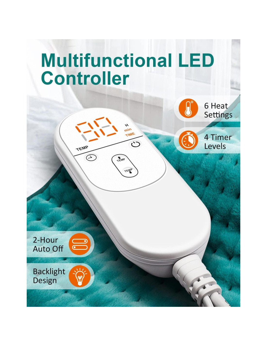 - Controlador LED Multifuncional: Puedes elegir entre 1-6 niveles de temperatura (40C~60C) y 4 niveles de temporizador (30/60/90/120 minutos). La gran pantalla digital y el diseño de retroiluminación del controlador hacen que tu operación sea más intuitiva y clara. Después de dos horas de uso, la almohadilla de calor se apagará automáticamente para proteger tu seguridad.