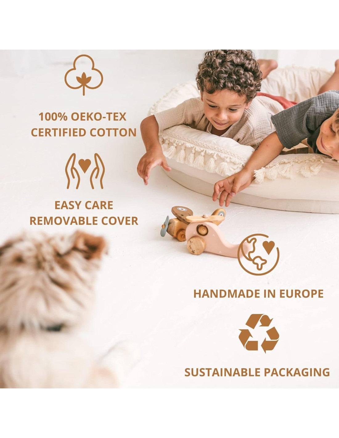 - [HIPOALERGÉNICA PARA JUEGO TODO EL DÍA]- Elaboradas con algodón natural y sin blanquear y relleno de poliestireno certificado por OEKO-TEX, estas alfombrillas de juego son hipoalergénicas, ultra transpirables e ideales para niños con piel sensible. La funda se puede lavar a máquina. Usando los cierres ocultos, saca la espuma y el relleno lateral, lava a 30 C/86 F y deja secar al aire. Plancha mientras esté húmeda.