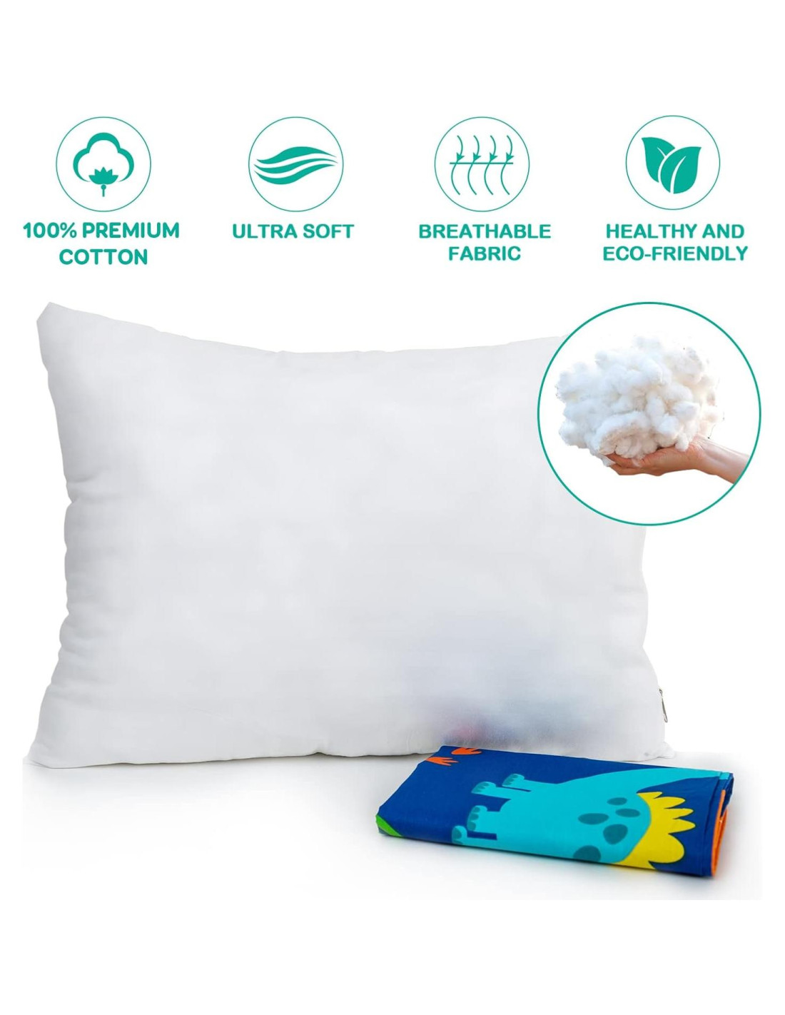- Lo Que Obtienes: [1-Conjunto] Almohada para Niños con Funda de Algodón Orgánico 100%: 1 x Funda de Almohada de Dinosaurio Azul y 1 Almohada Blanca (14" x 19"). Ten en cuenta que nuestro inserto de almohada no es de algodón puro, sin embargo, la funda de almohada está hecha completamente de algodón.