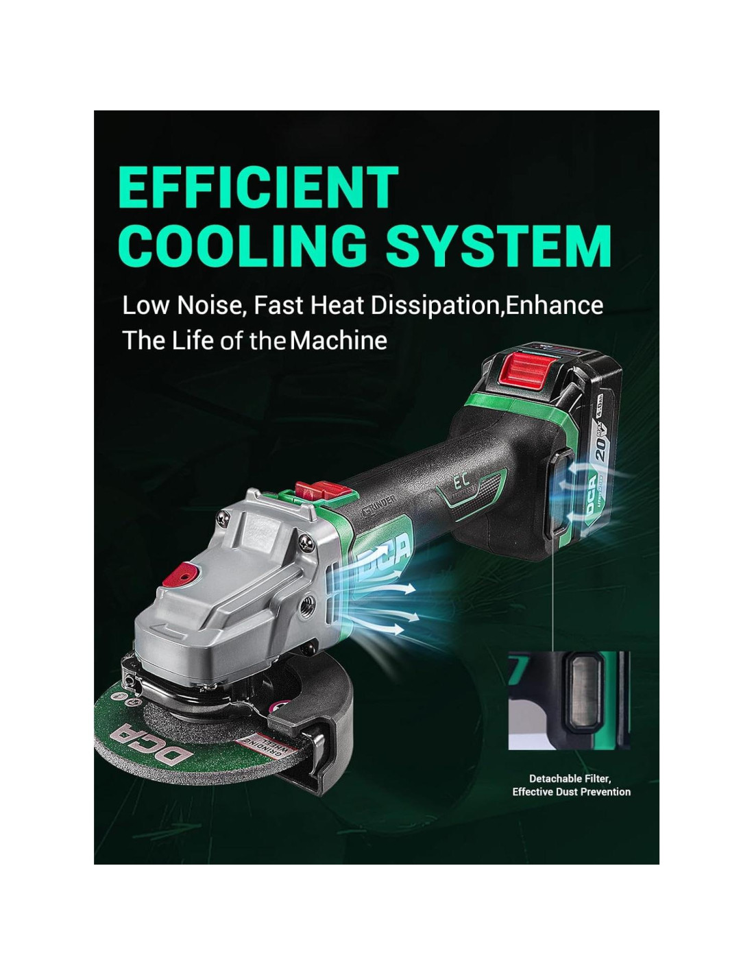 - Trabajo Fresco y Limpio: Las ventilaciones dimensionales están diseñadas para mantener la experiencia fresca y agradable incluso después de largas horas de trabajo, protegiendo el motor del daño por sobrecalentamiento y evitando que el polvo entre en la superficie y el interior del producto para prolongar la vida de la máquina