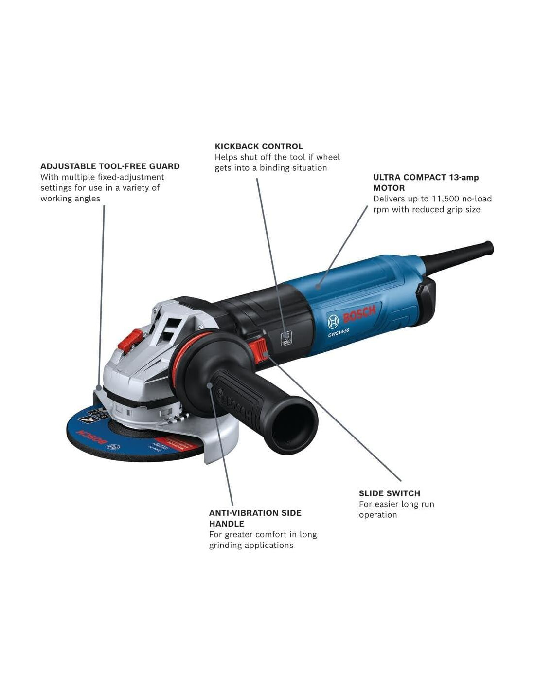 - COMPACTA PERO PODEROSA: La amoladora angular Bosch GWS14-50 de 5 In. con interruptor deslizante combina alto rendimiento y comodidad para una variedad de aplicaciones de molido y corte