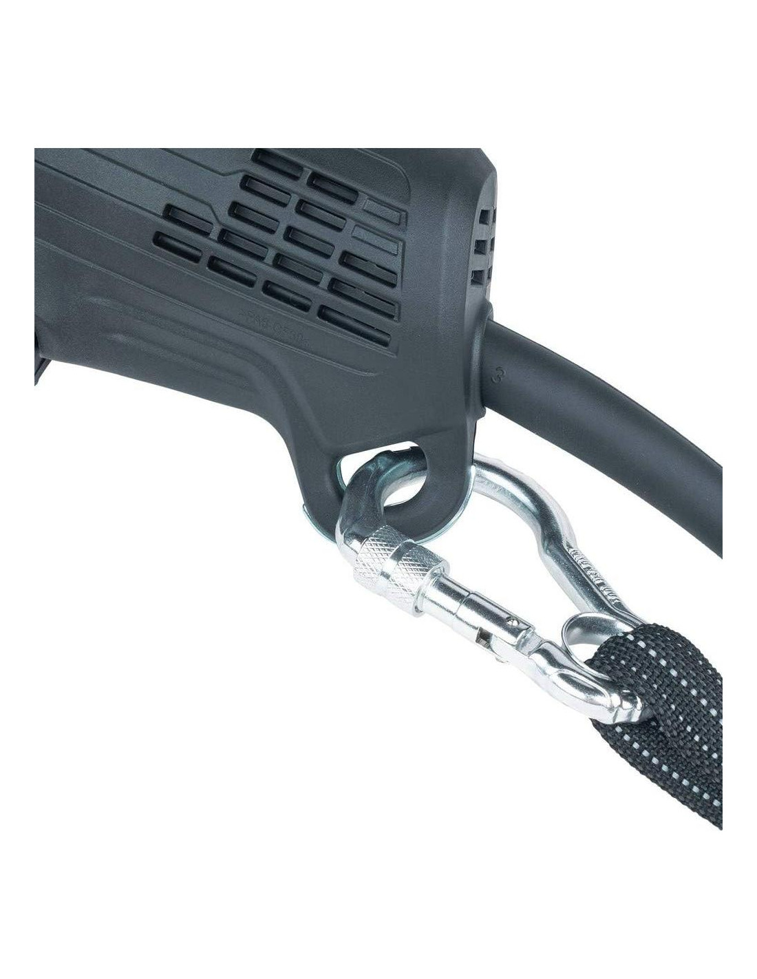 - Lazo de sujeción integrado se puede adjuntar a cordones cuando se trabaja en alturas o en un elevador