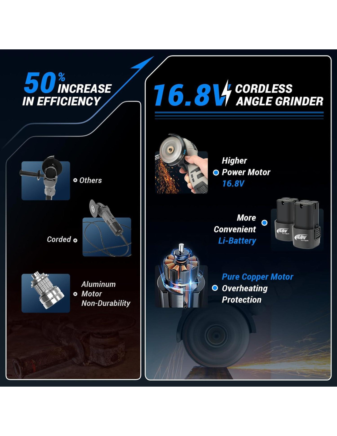 - Uso Inalámbrico/Carga de Batería Grande: La amoladora angular portátil inalámbrica funciona con batería de litio de 16.8V, el diseño inalámbrico elimina la molestia de los cables enredados, fácil de llevar, se puede usar en interiores y exteriores. Batería de litio recargable de gran capacidad de 2000mAh y un cargador rápido mantienen la amoladora angular funcionando de manera estable durante mucho tiempo.