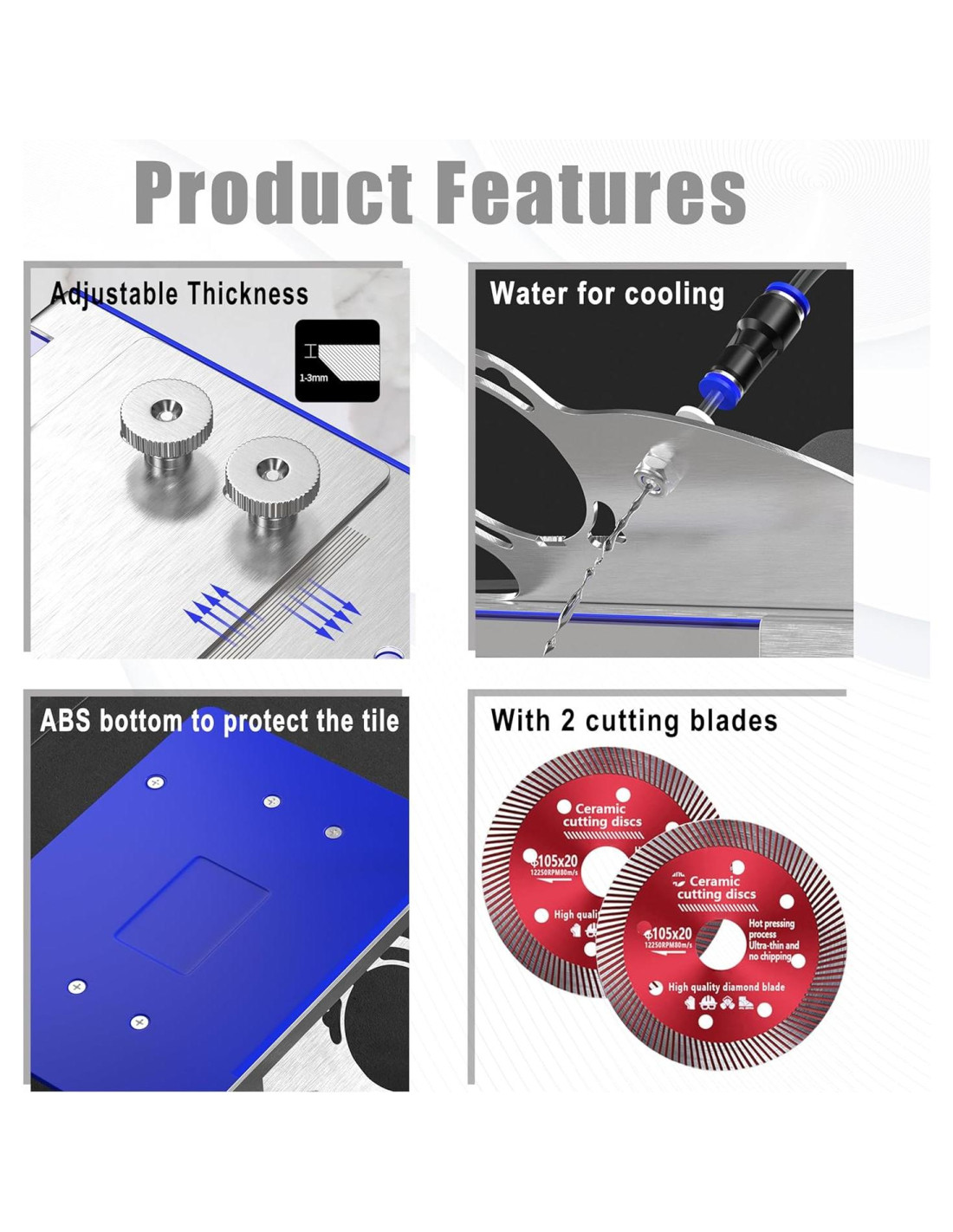 - Estructura Profesional: Esta herramienta de chaflán para azulejos está diseñada como un soporte fijo para realizar cortes estables y precisos. También incluye un conector de tubo para enfriar las cuchillas durante el trabajo de corte.