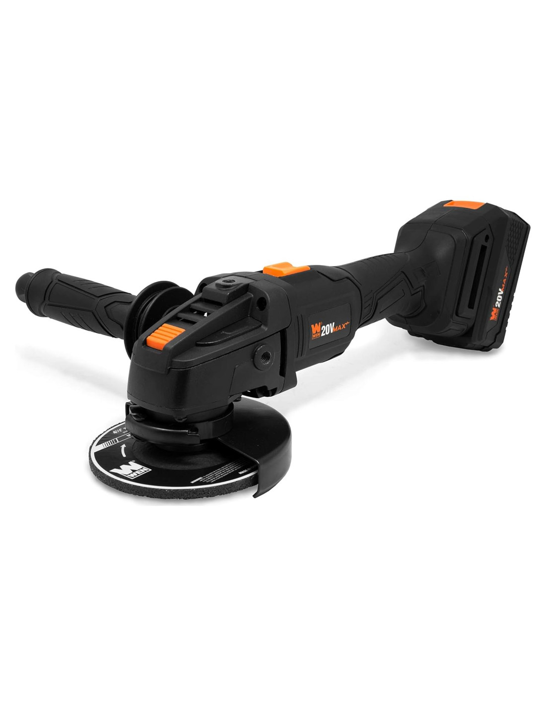 - Componentes incluidos: Amoladora Angular, una muela de 30-grit de 4-1/2 pulgadas, un bloqueo de husillo, un interruptor de encendido con bloqueo, una protección de rueda de ajuste rápido sin herramientas, y un cargador de batería de 2 amperios