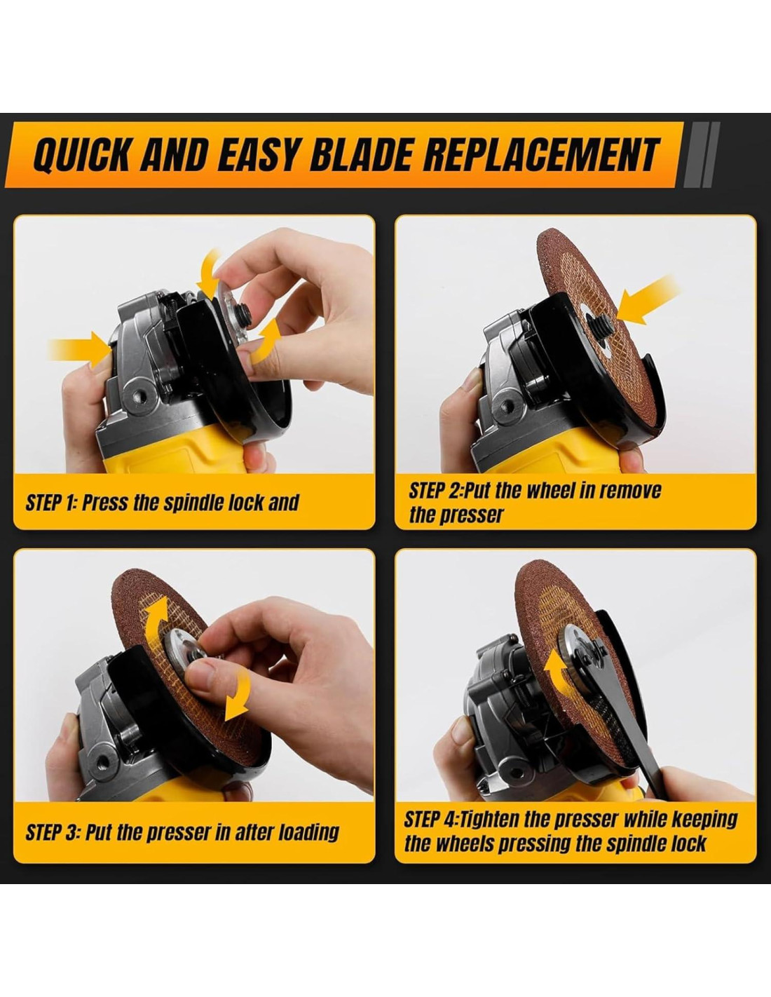 - [Amplia Aplicación] La Amoladora Angular Sin Escobillas sobresale en realizar una variedad de tareas, incluyendo cortar, moler, pulir y dar forma en metal, madera, así como en superficies de concreto. Con los accesorios especializados adecuados, también es capaz de esculpir y segmentar materiales de piedra como ladrillos y baldosas. También es experta en afilar cuchillas y varias herramientas de corte. Y la amoladora angular eléctrica cuenta con un husillo central de 5/8'-11 y es compatible con todo tipo de cuchillas de 4-1/2", discos, ruedas de lijado