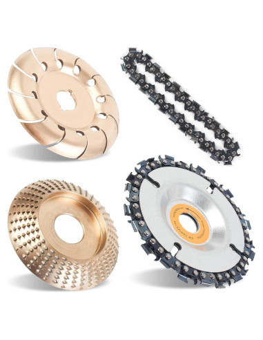 - [Compatible con amoladoras angulares de 4" o 4 1/2" con Arbor de 5/8"] El juego de accesorios para amoladora angular incluye 1 disco de sierra de cadena de 22 dientes (diámetro de 4" (10,16 cm) x orificio de 5/8" (1,59 cm)), 1 pieza de cadena de repuesto, 1 disco de corte de madera de 12 dientes (diámetro de 3.55" (9,02 cm) x orificio de 5/8" (1,59 cm)), 1 rueda de molido de madera con buje de plata (diámetro de 3.31" (8,41 cm) x orificio de 5/8" (1,59 cm)). Diseñado para ser utilizado en todas las amoladoras angulares estándar de 4" (10,16 cm) o 4 1/2" (11,43 cm) con 5/8" (1,59 cm) así como arbor M10.