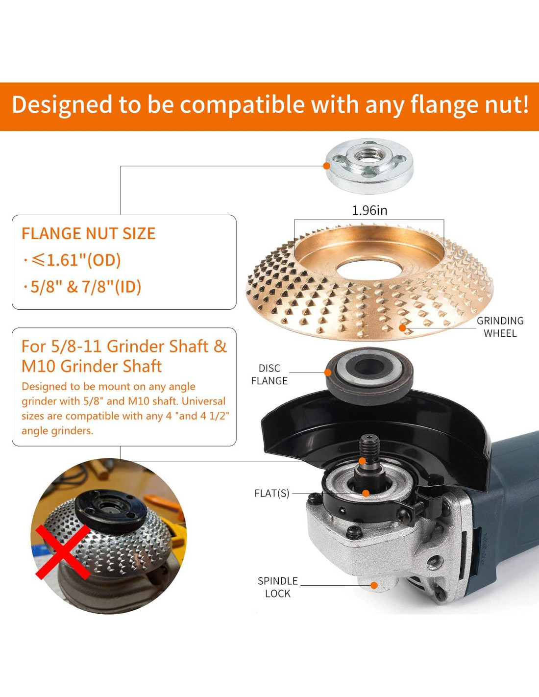 - [Diseño Mejorado] Después de revisar todas las quejas sobre el juego de discos de molido vendidos en Amazon, nuestro ingeniero mejoró el diámetro del disco de 12 dientes de 2 1/2" (6,35 cm) a 3 1/2" (8,89 cm) para ser compatible con amoladoras angulares de 4" (10,16 cm) y 4 1/2" (11,43 cm). Además, las ranuras del disco de tallado en madera se han ampliado para adaptarse a la tuerca de brida negra de 1.61" (4,1 cm) de uso común. Así que todas las piezas funcionan directamente al sacarlas de la caja.