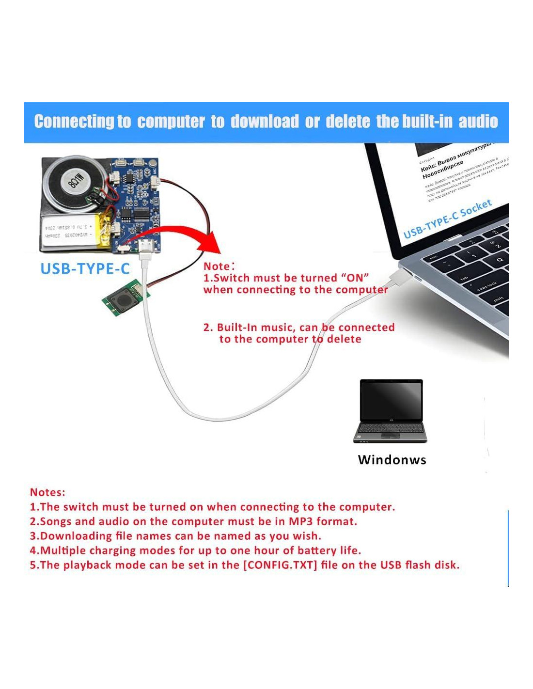 - Módulo de Grabación Cargable por USB: Este módulo de grabación cuenta con un diseño recargable y está equipado con una batería de gran capacidad de 3.7 V (230 mAh), completamente cargada toma aproximadamente 90 minutos, reproduce durante aproximadamente 120 minutos. Se puede cargar convenientemente a través de la interfaz Micro USB Tipo-C. Este diseño extiende la vida de la batería, permitiendo un uso prolongado sin necesidad de reemplazo de batería. Puedes cargarlo fácilmente conectándolo a una computadora o usando un cargador, asegurando una batería completa y permitiendo un uso duradero con ciclos de carga repetidos.