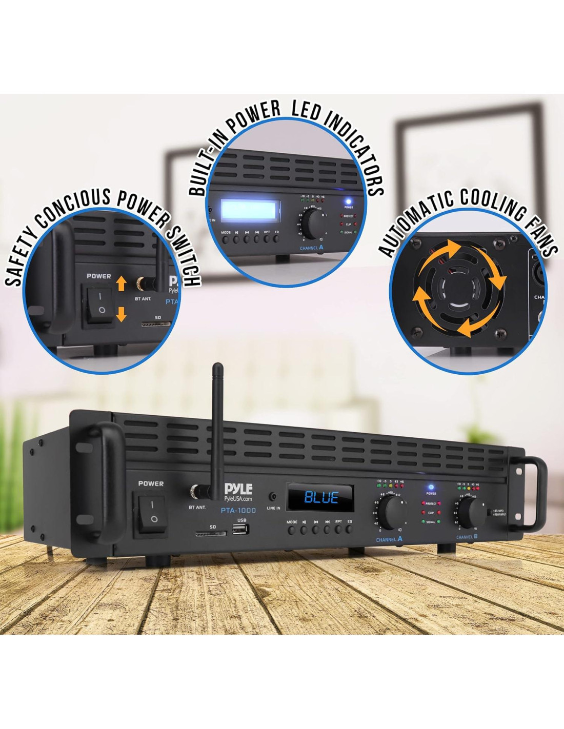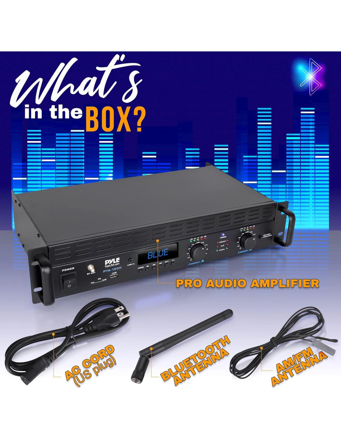 Características: - Amplificador Pro Audio de 2 Canales - Amplificador Puenteable: Capacidad de Modo Puente - Transmisión Inalámbrica Bluetooth Incorporada - Con Pantalla LCD, puede mostrar formato ID3. - (2) Conectores de Entrada TRS de 1/4'' - (2) Conectores de Entrada XLR - (3) Conectores de Salida SpeakOn (A/B/Puenteado) - (2) Terminales de Altavoz / Conectores de Poste de Unión - Indicadores LED de Potencia, Protección, Clip, Señal - Indicadores de Nivel de Señal de Canal Izquierdo y Derecho - Ventiladores de Enfriamiento de Ventilación Incorporados - Centro de Control en el Panel Frontal - Sistema Montable en Rack Conectividad Bluetooth: - Emparejamiento Simple y Sin Complicaciones - Capacidad de Transmisión de Audio Inalámbrico Instantáneo - Funciona con Todos los Dispositivos Bluetooth Más Recientes de Hoy en Día - (iPhone, Android, Smartphone, iPad Tablet PC, etc.) - Nombre de Red Bluetooth: 'PYLE PRO' - Versión de Bluetooth: 5.0 - Rango Inalámbrico: Hasta 30' (9,14 m) ¿Qué hay en la Caja?: - Amplificador Pro Audio - Cable de Alimentación - Antena BT y FM Especificaciones Técnicas: - Salida de Potencia: 2000 Watt MAX - Tipo de Amplificador: 2-Canales - 2 x 1000 Watt @ 4 Ohm - 2 x 500 Watt @ 8 Ohm - Distorsión: <1.0% - Nivel de Entrada: +4dB - Relación Señal/Ruido: 102dB - Respuesta de Frecuencia: 20Hz - 20kHz, +/-0.2dB - Fuente de Alimentación: 120/220V, Conmutable - Dimensiones del Producto (L x W x H): 19.09'' x 9.84'' x 3.54'' - pulgadas.