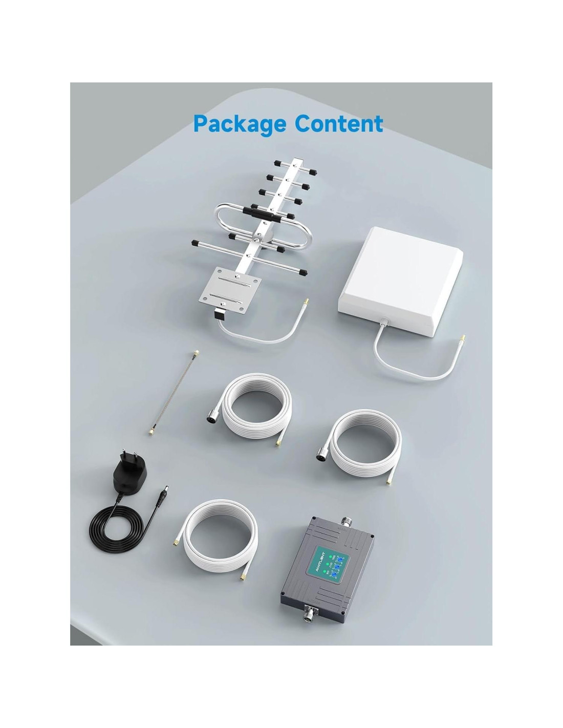- Contenido de la caja: Amplificador N30, Antena Direccional Exterior, Antena de Panel Interior, Cable de Entrada por Ventana, 3 Cables Loger (2 x 16', 1 x 33'), Fuente de Alimentación, Cinta Impermeable, Cinta de Gestión de Cables