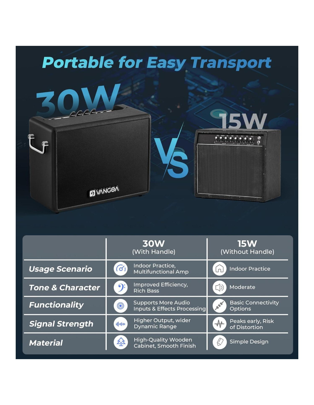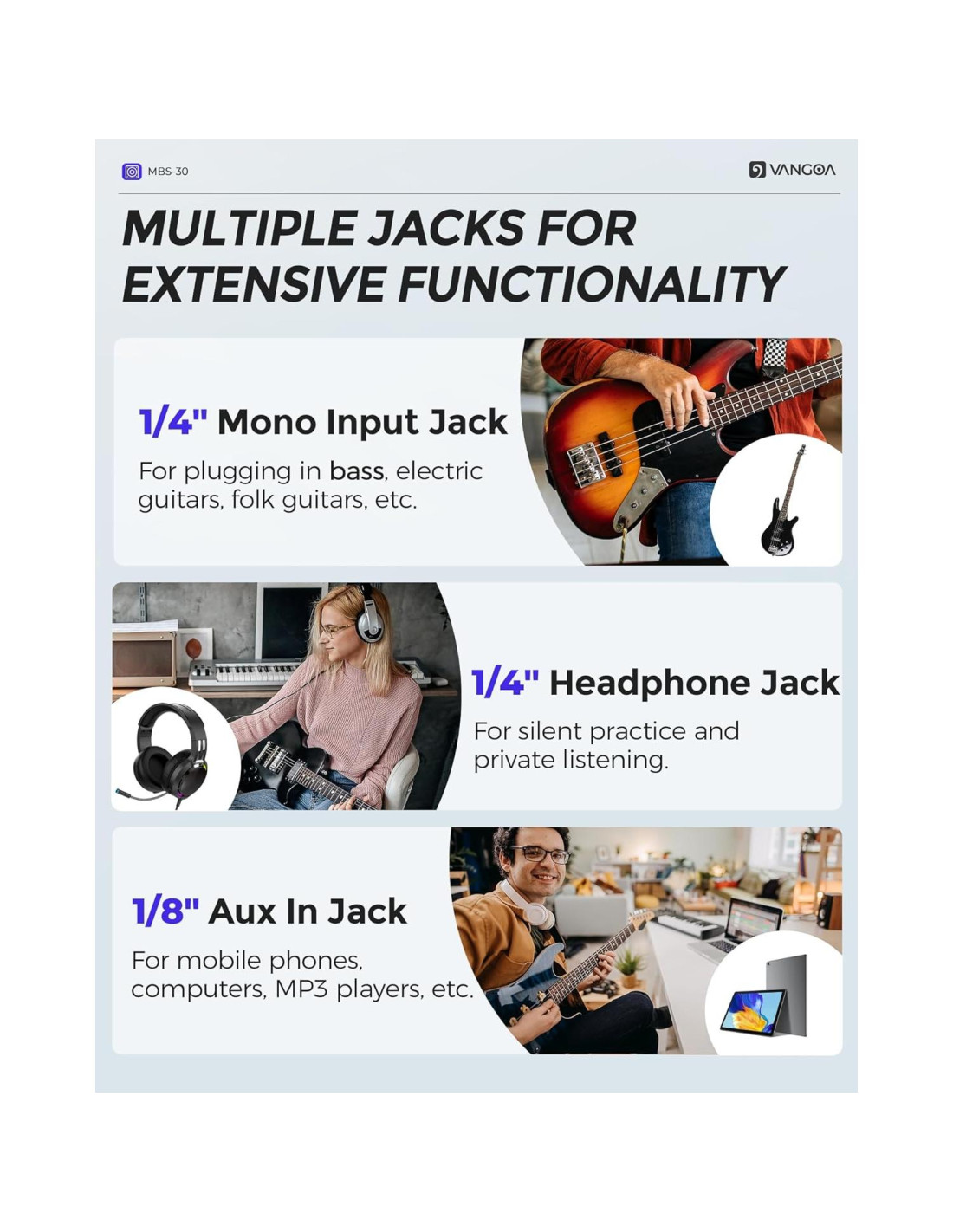 Un amplificador de bajo es un dispositivo electrónico que amplifica instrumentos de tono bajo como guitarras bajas o contrabajos para que los intérpretes y el público puedan escuchar. Explora tonos de bajo desde un gruñido clásico y áspero hasta un golpe moderno digno de slap con el circuito de overdrive recién desarrollado y los controles de contorno conmutables. Diseñado para diferentes instrumentos como guitarra baja, contrabajo y saxofón barítono, presenta varios tonos. Perfecto para la práctica de principiantes. El conector de entrada de instrumento de 1/4" y el conector de entrada auxiliar de 1/8" se pueden conectar a instrumentos musicales, computadoras, teléfonos, MP3. Se puede lograr una ganancia y deducción precisas de las bandas de frecuencia alta, media y baja a través de un ecualizador de tres bandas. Con una potencia de salida de 30W, este amplificador de bajo eléctrico soporta alto volumen y produce un sonido potente y claro, que es muy adecuado para la práctica diaria. Amplificador de Bajo de 30 W. Amplificador de Bajo de 15 W. Acústico Eléctrico de 36". Acústico Eléctrico de 3/4. Kit de Guitarra Acústica de 3/4.