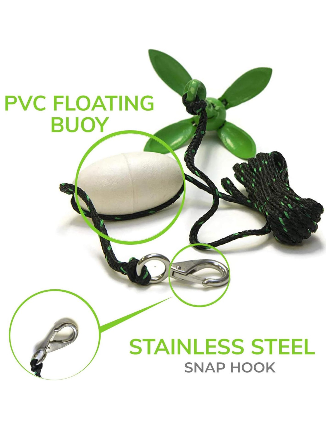 - Ancla para barco pequeño: El ancla es resistente a la corrosión con 25 pies (7,62 m) de cuerda marina verde/negra (7 mm de grosor). También incluye una boya de flotación de PVC y un gancho de acero inoxidable para conexiones rápidas y fáciles.