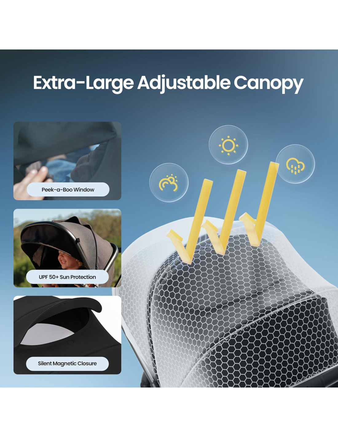 - Comodidad silenciosa y protección total: Un dosel con UPF 50+ que se puede quitar proporciona protección solar total, mientras que la ventana de ventilación superior utiliza un pestillo magnético silencioso, permitiendo un funcionamiento silencioso para que tu bebé no se vea perturbado durante las siestas. Incluye un portavasos, cubierta para pies, cubierta de lluvia y adaptador de asiento de auto para un sistema de viaje completo.