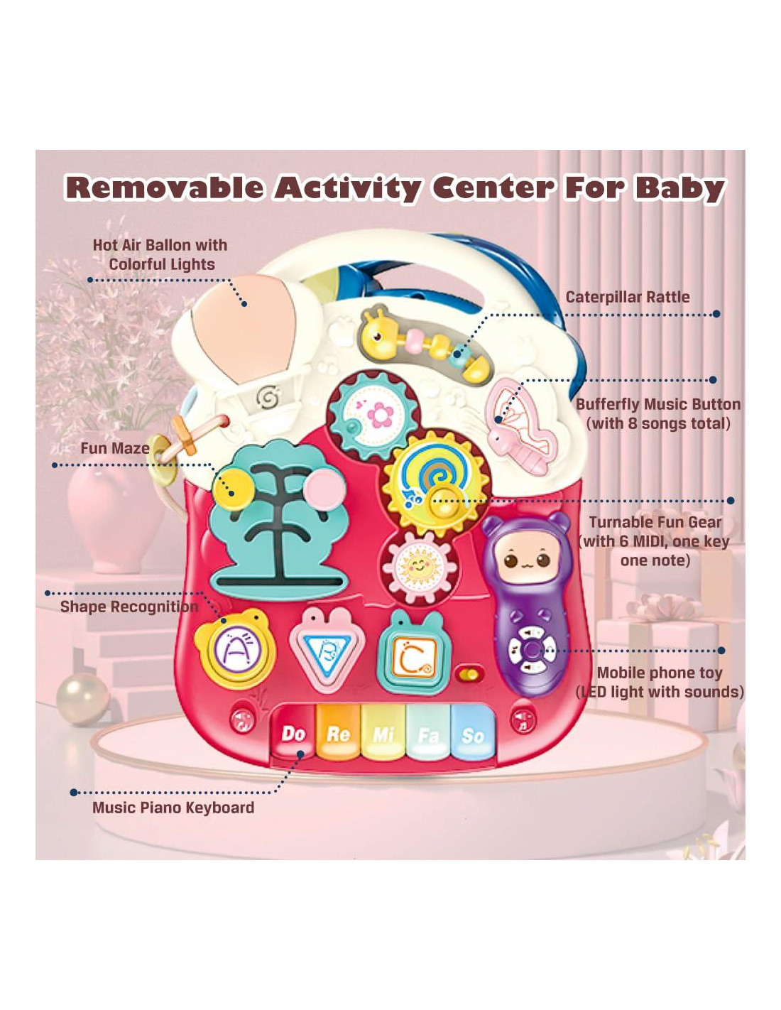 - [Panel de entretenimiento desmontable] : Este panel de juego desmontable cuenta con 3 bloques de reconocimiento de formas, 3 rodillos giratorios coloridos, 5 teclas de piano, 1 juguete de teléfono móvil, botón de música de mariposa con 8 canciones, este nuevo panel de diseño es muy útil para ayudar al bebé a reconocer colores y formas, impulsar el desarrollo intelectual y mejorar las habilidades motoras finas, fomentando la creatividad de tu bebé.