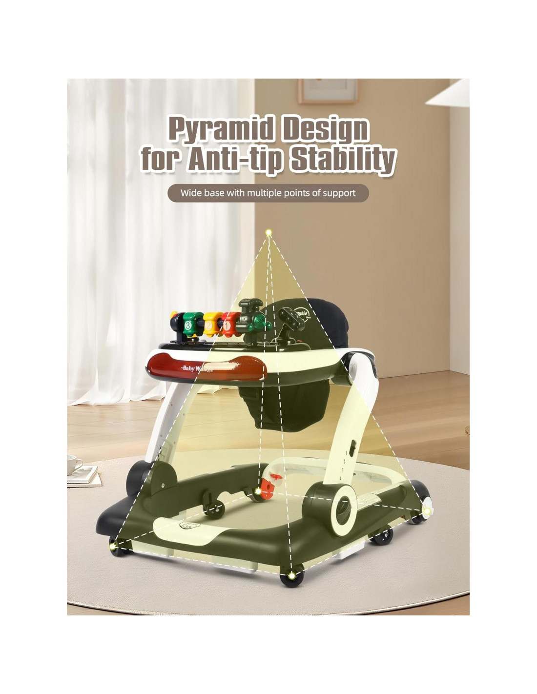 - SEGURIDAD ANTE TODO: El andador para bebés viene con 4 almohadillas antideslizantes (frenos asistidos), 4 ruedas de doble nivel y 2 ruedas ajustables en velocidad. Certificado por ASTM y CPSIA, el andador para bebés tiene un chasis más grande y fuerte para asegurar que tu pequeño esté seguro y feliz.