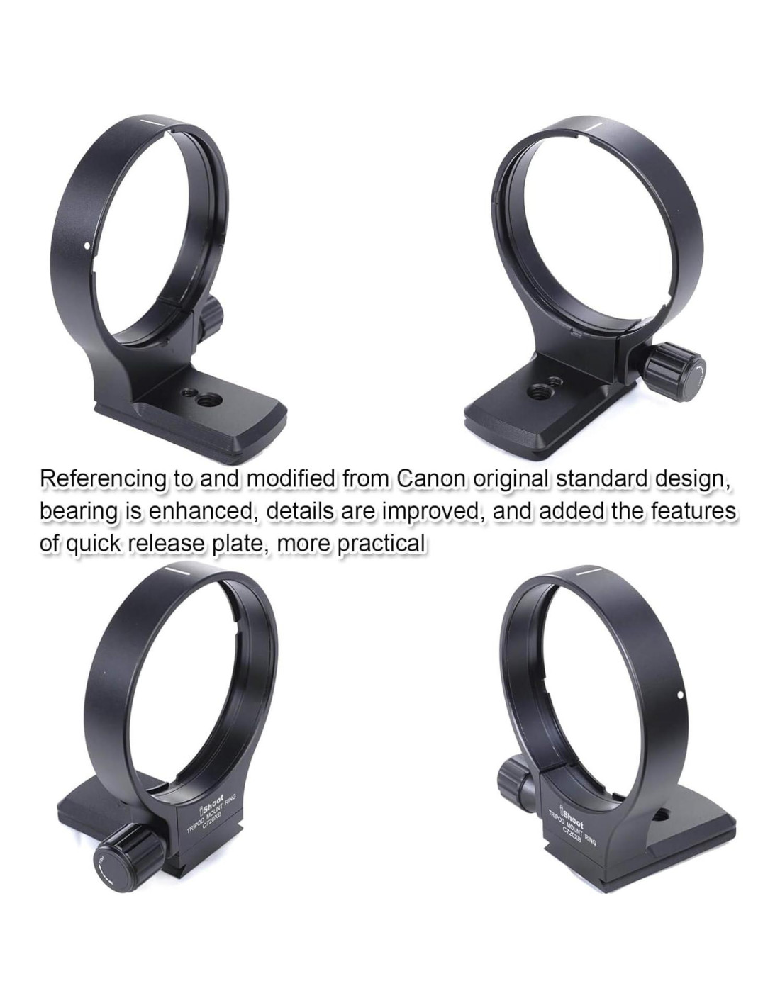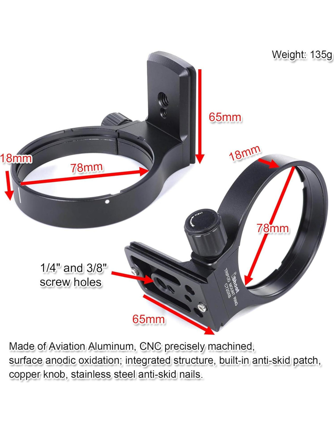 Anillo de Montaje en Trípode, Soporte de Collar de Lente de 78mm iShoot para Canon EF 70-200mm f/2.8L IS/II/III USM, 100-400mm f/4.5-5.6L IS USM y 300mm f/4L IS USM, Placa de Liberación Rápida Tipo Arca-Swiss Incorporada Características Principales: 1. El soporte de lente se refiere y se modifica del diseño estándar original de Canon, el rodamiento se ha mejorado, los detalles se han mejorado y se han añadido las características de la placa de liberación rápida, más práctica; 2. El collar de lente está hecho de Aluminio de Aviación, mecanizado con precisión CNC, oxidación anódica en la superficie; estructura integrada, parche antideslizante incorporado, perilla de cobre, clavos antideslizantes de acero inoxidable; 3. El peso neto del anillo de montaje en trípode es de aproximadamente 135g, el diámetro interior es de aproximadamente 78mm, el ancho del anillo es de aproximadamente 18mm; 4. La parte inferior es una placa de liberación rápida de 65mm de longitud, con agujeros para tornillos de 1/4" y 3/8"; 5. La placa de liberación rápida es estándar AS de 39mm, compatible con RRS/ARCA-SWISS/KIRK/WIMBERLEY/MARKINS/SUNWAYFOTO/KANGRINPOCHE/BENRO/SIRUI/MARSACE/ISHOOT cabezal de bola de ajuste Arca de 39mm, adecuada para iShoot IS-JZ30/IS-JZ50/IS-JZ64/IS-QJ58/IS-QJ64/IS-QJ64-FD/IS-JZ60BK/IS-JZ70MFT/IS-JZ80BK. Aplicable a: Canon EF 70-200mm f/2.8L USM Lente Canon EF 70-200mm f/2.8L IS USM Lente Canon EF 70-200mm f/2.8L IS II USM Lente Canon EF 70-200mm f/2.8L IS III USM Lente Canon EF 100-400mm f/4.5-5.6L IS USM Lente Canon EF 35-350mm f/3.5-5.6L USM Lente Canon EF 300mm f/4L IS USM Lente El Paquete Incluye: 1 x Anillo de Montaje en Trípode iShoot IS-C720XB (Los otros artículos en las fotos no listados aquí son solo para ilustrar, no incluidos)