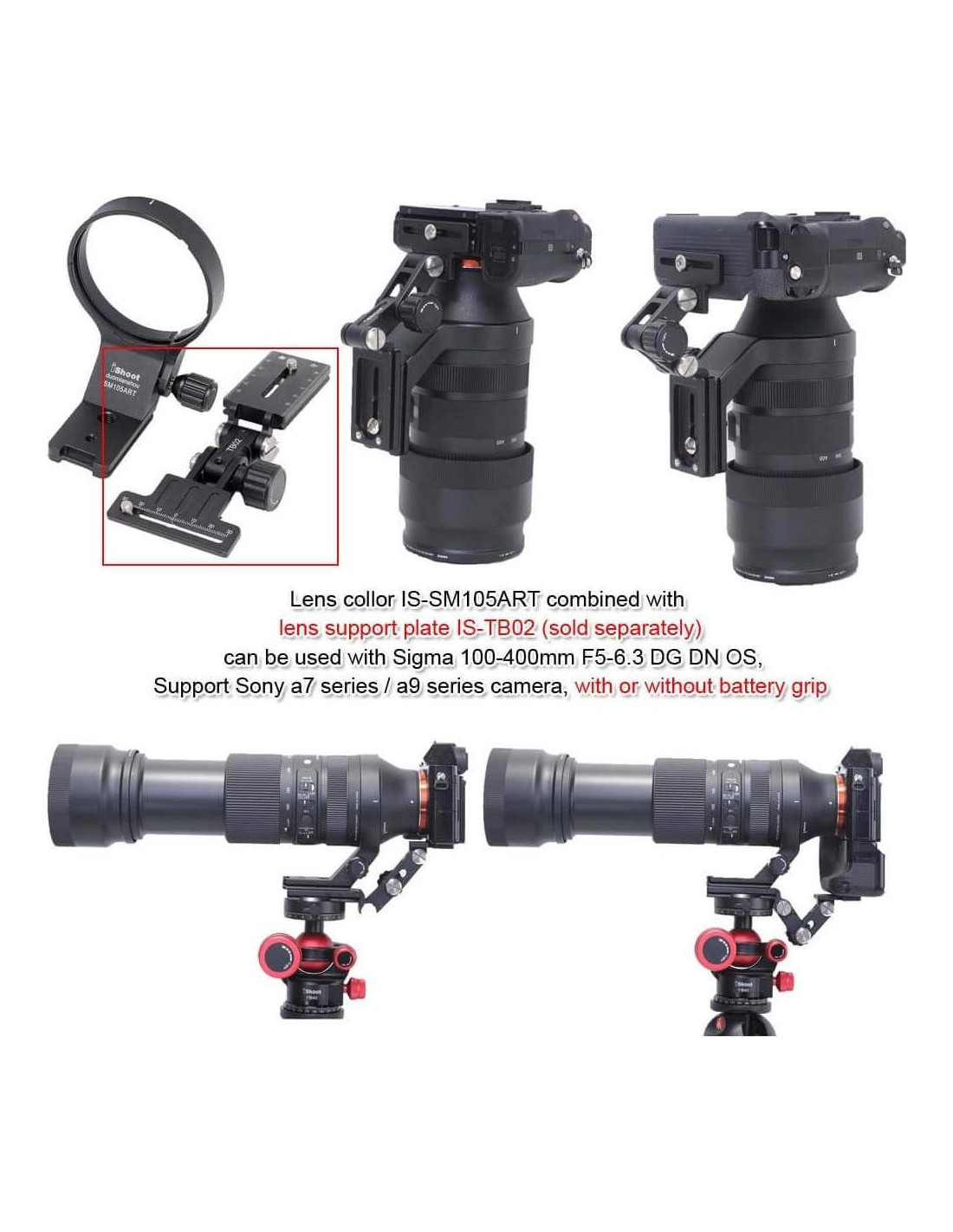Anillo de soporte de lente iShoot IS-SM105ART compatible con Sigma 105mm F1.4 DG HSM Art y Sigma 100-400mm F5-6.3 DG DN OS. La base es placa de liberación rápida Arca. Características: 1. El collar de soporte de lente está diseñado y mejorado con referencia al original TS-111 de Sigma; el diámetro interno es de aproximadamente 82mm, el ancho es de aproximadamente 18mm, la pared interna tiene ranuras y muescas, y se adhiere una película protectora de plástico 3M; perilla de bloqueo con diseño antideslizante; 2. La placa de liberación rápida inferior del soporte de lente tiene aproximadamente 65mm de longitud, adopta el ajuste estándar ARCA-SWISS/RRS de 39mm, y reserva agujeros para tornillos de 1/4 y 3/8, equipada con tornillos antideslizantes de acero inoxidable, peso neto de aproximadamente 170g; 3. La placa de liberación rápida inferior es estándar AS, compatible con cabezales de bola RRS/ARCA-SWISS/ISHOOT de ajuste Arca de 39mm, adecuada para iShoot IS-JZ30/IS-JZ50/IS-JZ64/IS-QJ58/IS-QJ64-FD/IS-JZ60BK/IS-JZ70MFT/IS-JZ80BK; 4. El anillo de trípode está hecho de aluminio aeronáutico, mecanizado con precisión CNC, diseño de reducción de peso hueco, acabado pulido y anodizado en superficie. La apariencia y la exquisita mano de obra son mucho mejores que productos similares fabricados por molde. Compatible con: Sigma 100-400mm f/5-6.3 DG DN OS (E-mount/L-Mount) Sigma 105mm f/1.4 DG HSM Art (EF/FX/FE/L-mount) No se puede usar para Sigma 100-400mm f/5-6.3 DG OS HSM Contemporary (F Mount/EF Mount) y otros lentes. El paquete incluye: 1 x Anillo de lente iShoot IS-SM105ART