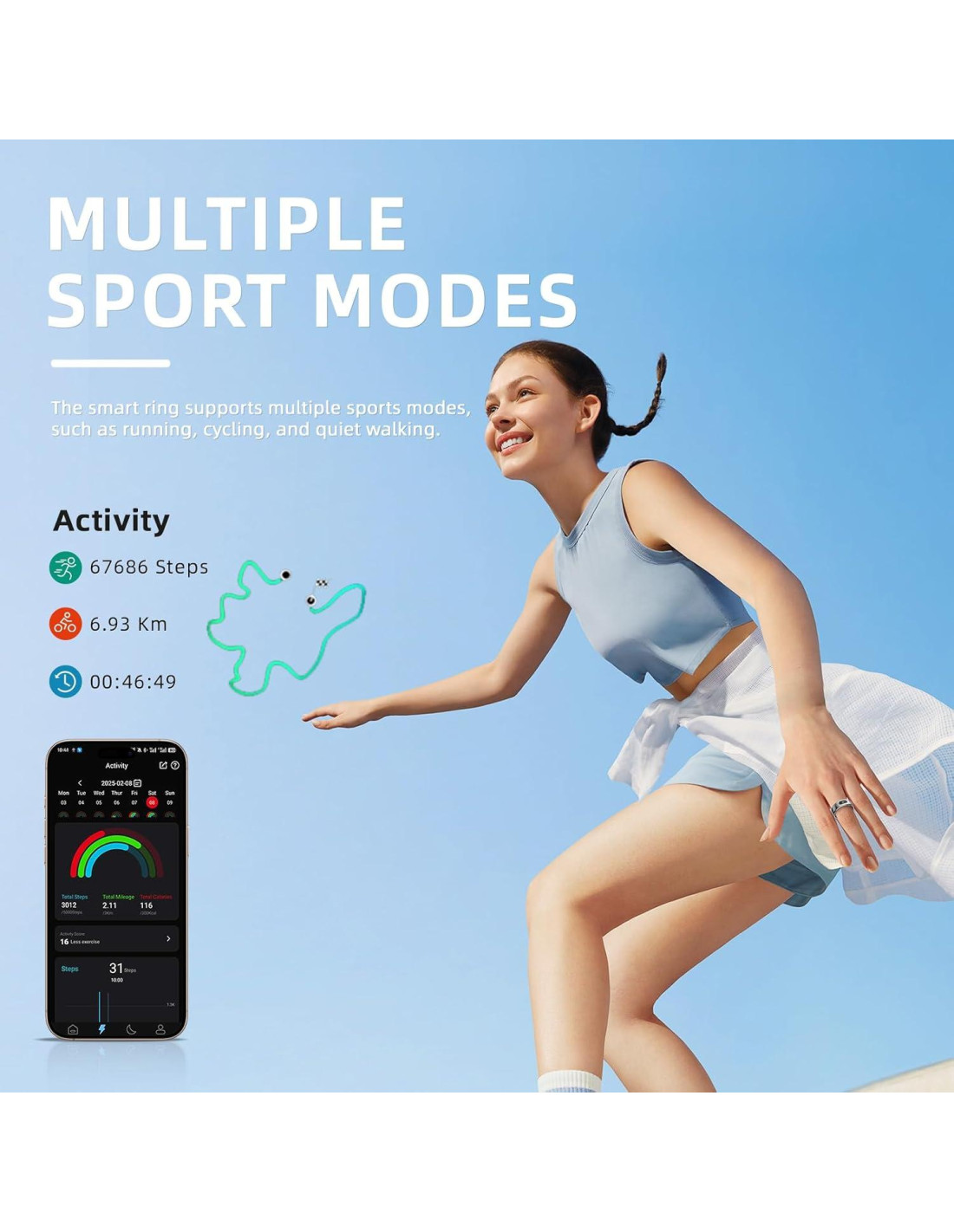 - Compatibilidad Universal Sincronización fácil con dispositivos iOS y Android a través de la aplicación, proporcionando actualizaciones en tiempo real e información útil para mantenerte informado y motivado.