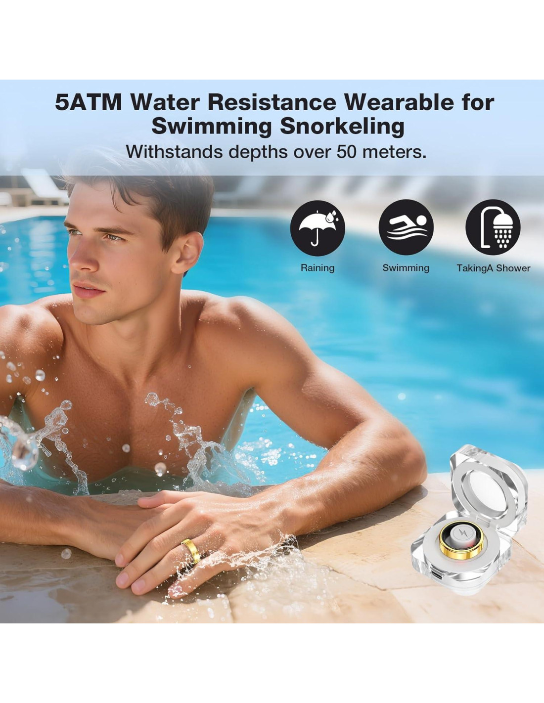 - Diseño a prueba de agua: Hecho de materiales duraderos, este anillo inteligente es a prueba de agua hasta IP68, lo que puede satisfacer las necesidades de tu vida diaria - ya sea que estés en el gimnasio, en la ducha o caminando bajo la lluvia.