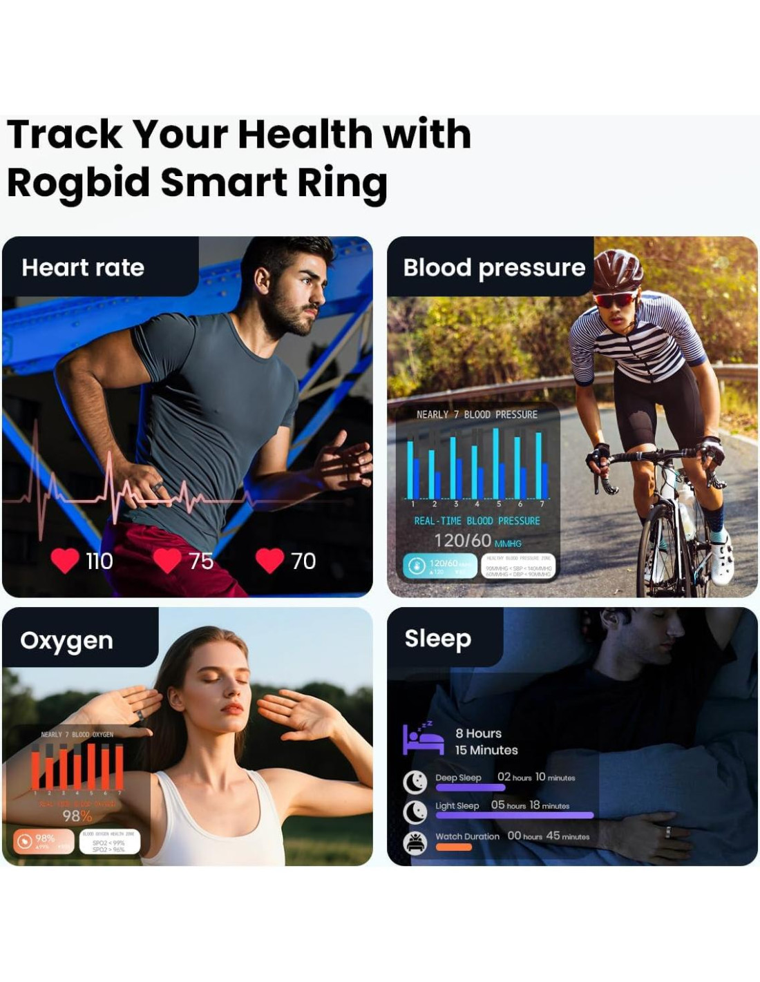 - Larga Duración de Batería y Amplia Compatibilidad: Los anillos inteligentes Rogbid duran hasta 7-10 días con una carga de 2 horas. Además, un estuche de carga portátil con batería de 480 mah, puede cargar completamente el anillo inteligente de 20 a 23 veces, lo que extiende enormemente el rendimiento, ideal para viajeros de negocios frecuentes y entusiastas del aire libre, asegurando un monitoreo continuo de la salud sin importar dónde estés. Es compatible con Android 9.0 y iOS 10.0+ y HarmonyOS