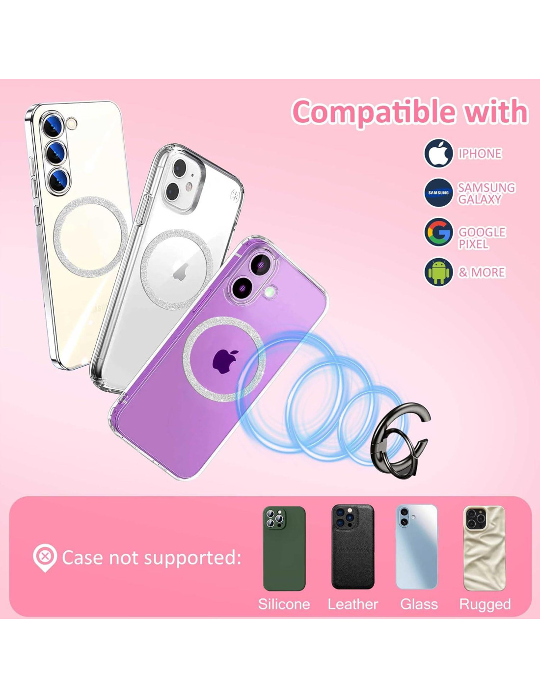 - Compatible con Carga Inalámbrica: El sticker del anillo metálico NO ES MAGNÉTICO, pero mejora el agarre con todos los accesorios magnéticos como cargadores/billeteras/baterías portátiles. Diseño ultra delgado de 0.03" (0.08 cm) completamente compatible con carga inalámbrica.