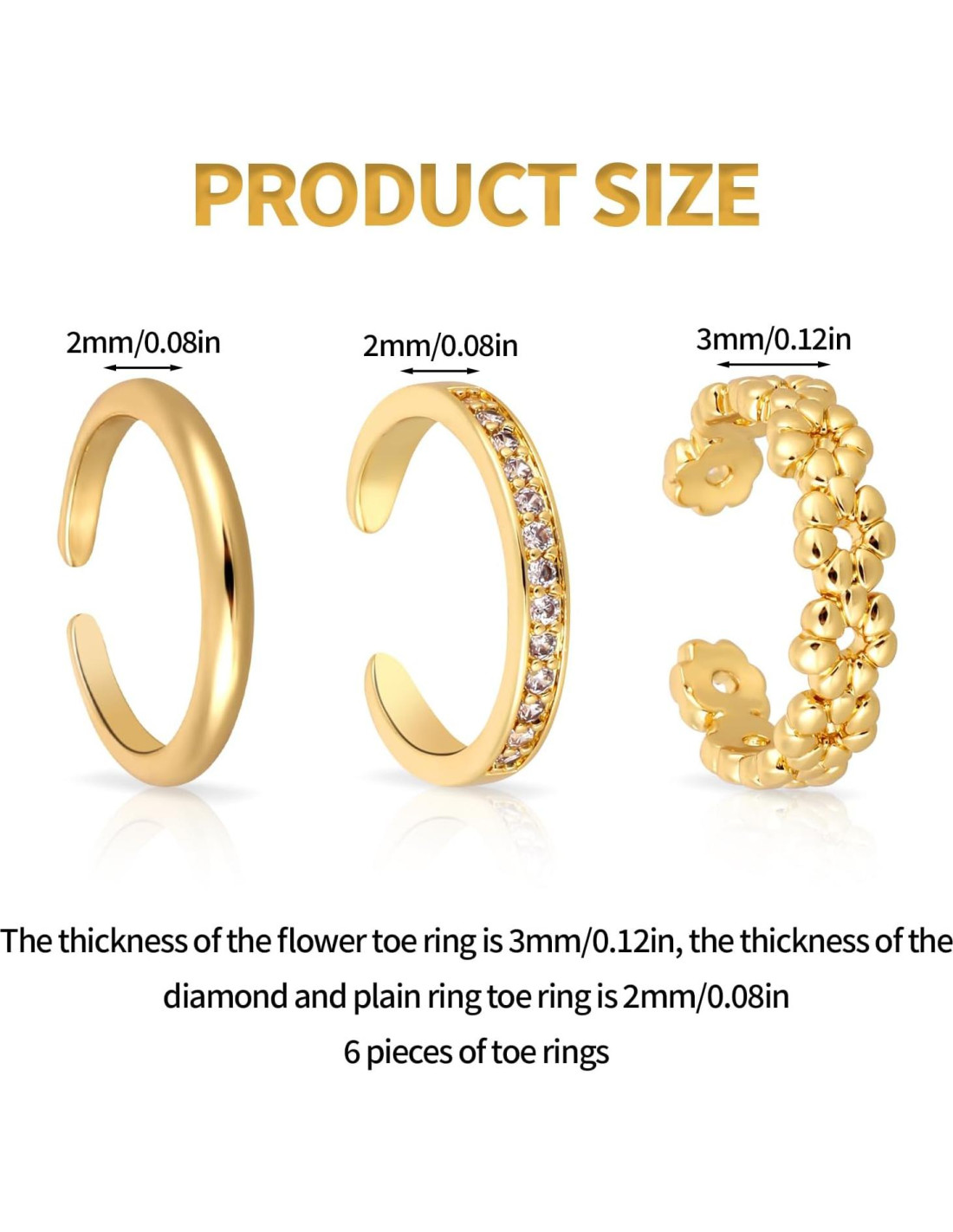 Especificación: Color: dorado Material: cobre Tamaño del producto: grosor del anillo de dedo del pie de flor: 3mm (0.12in); grosor de los anillos de dedo del pie simple con diamante y simple liso: 2mm (0.08in) Detalles del paquete: 6 x anillos de dedo del pie Nota: Debido a la medición manual, el tamaño y el peso pueden tener un cierto error. Debido a la diferencia entre monitores, puede existir una ligera diferencia de color.