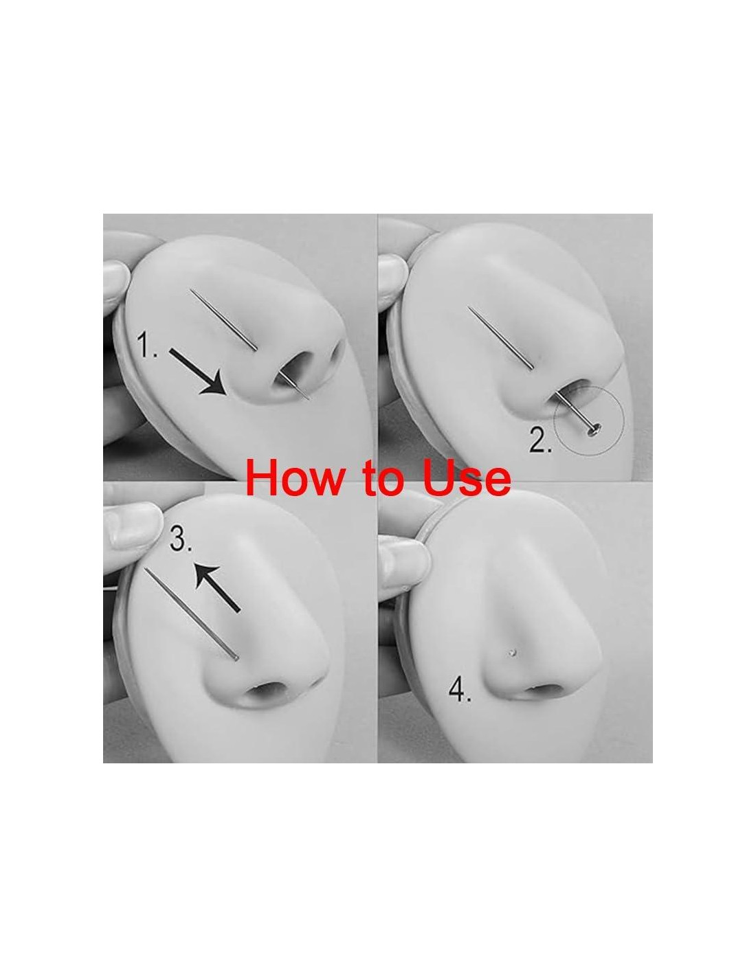 - Paquete: 6 piezas de aros de nariz, 4 piezas de studs de nariz en forma de L, 4 piezas de studs de nariz de respaldo plano, 6 piezas de tornillo de nariz, 1 pieza de pin de inserción de taper de piercing recto
