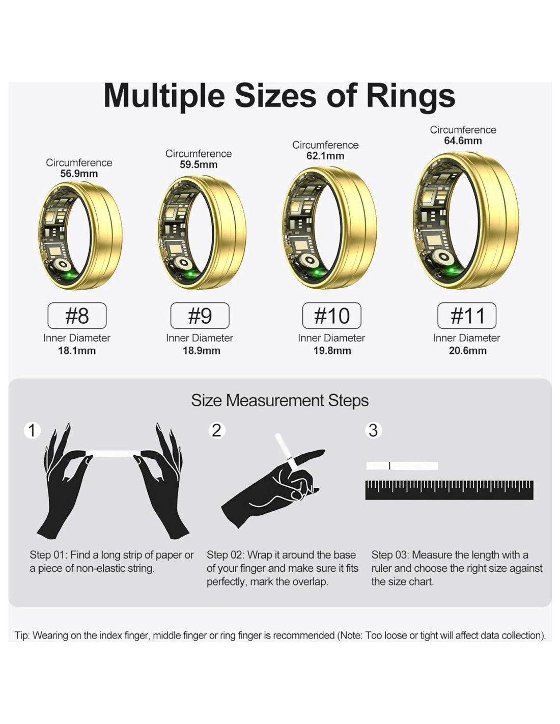 - [Múltiples Opciones y Sin Tarifas de Suscripción] El anillo inteligente está disponible en 2 colores y 4 tamaños para que elijas entre 18.1mm (#8) 18.9mm (#9) 19.8mm (#10) 20.6mm (#11). Puede rastrear fácilmente tu estado de sueño, datos corporales y más a través de la aplicación móvil SIN tarifas de suscripción. (Por favor, mide la circunferencia de tu dedo de acuerdo con el diagrama en la página de detalles antes de comprar)