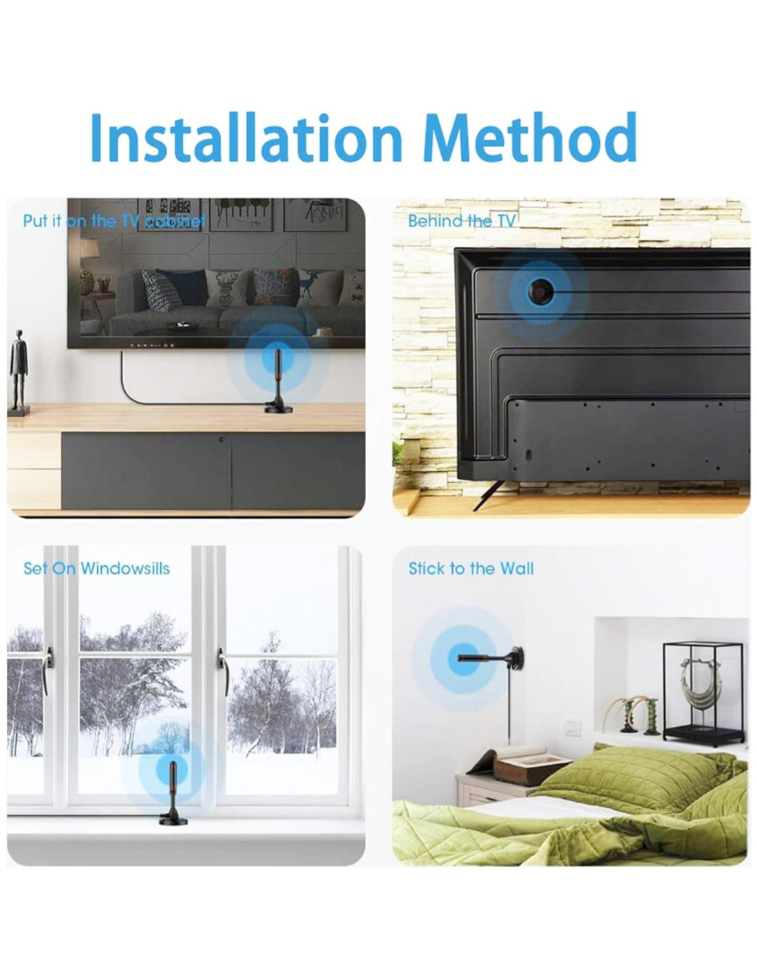 - Notas: Coloca la antena lo más alta y cerca de la ventana posible; Por favor, sigue la guía de instrucciones para instalar y conectar la antena con el STB o TV.