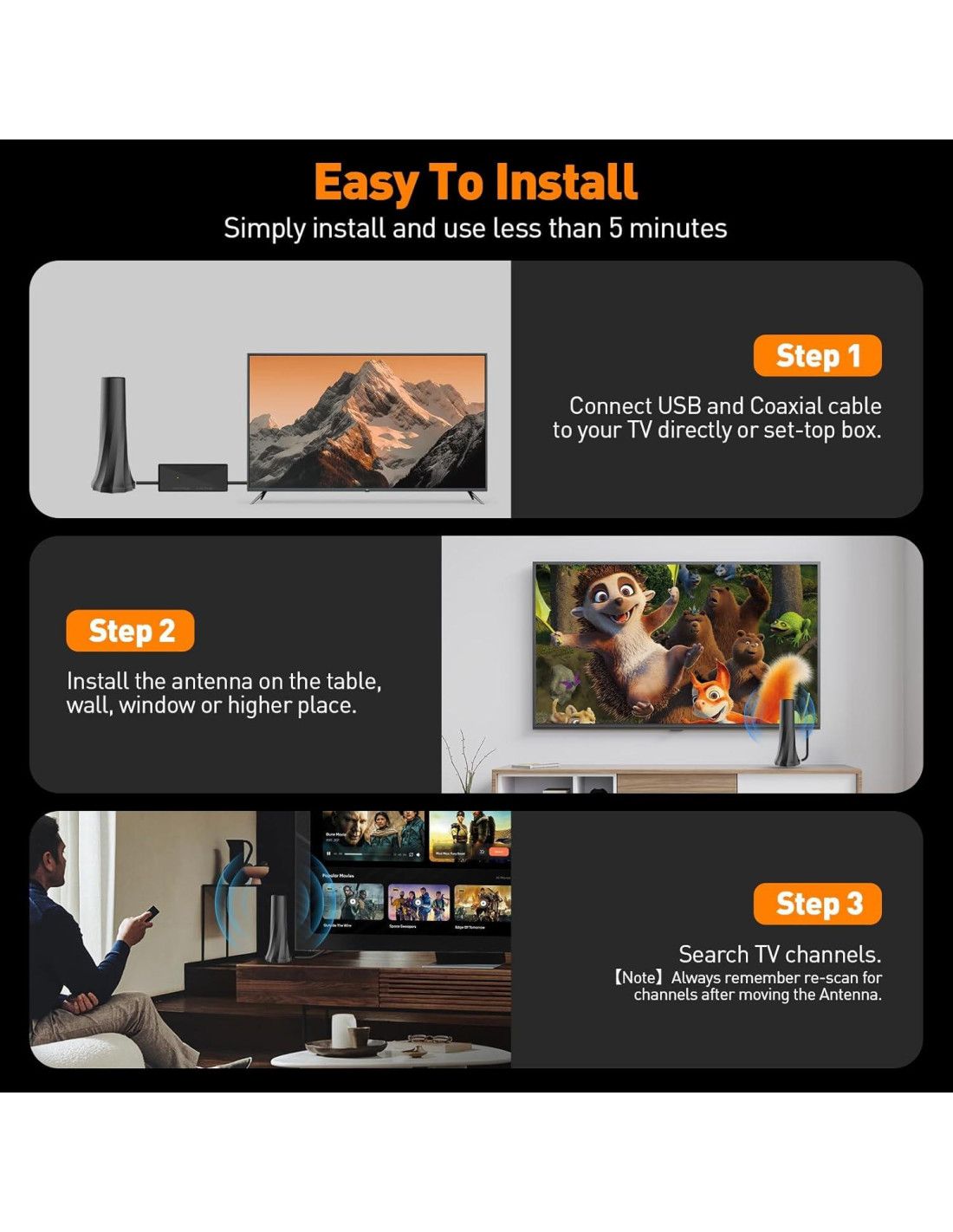 - Fácil de instalar - Puedes colocar la antena de TV inteligente detrás de tu TV o frente a una ventana, y nos aseguramos de que puedas completar la instalación en unos minutos. Con la antena HDTV WU-MINGLU, puedes disfrutar de muchos canales en tu sala de estar, dormitorio, sótano, RV y más. Si tu TV tiene múltiples sintonizadores integrados, simplemente conecta un extremo de cada cable coaxial en cada terminal de TV de tu antena y el otro extremo en cada entrada coaxial correspondiente en el puerto USB de tu TV.
