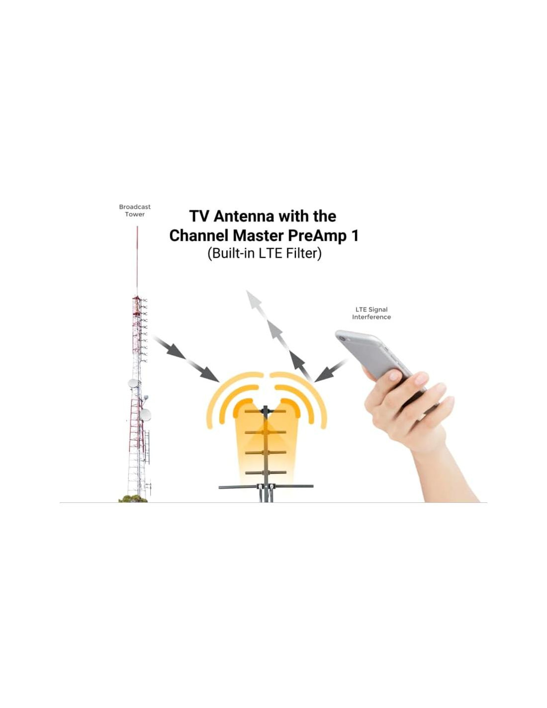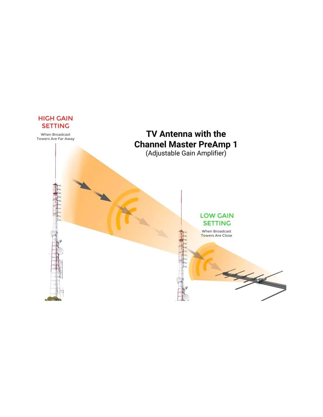 El PreAmp 1 de Channel Master es un amplificador de antena de TV de grado profesional diseñado para mejorar el rendimiento de cualquier antena de TV exterior (no amplificada). Aumentará la fuerza de la señal de la antena, mejorará la calidad de la señal y puede aumentar el número de canales recibidos. Incluye un interruptor de ajuste de ganancia alta/baja ubicado en el inserto de alimentación y se puede ajustar desde el interior de la casa. Este amplificador también aprovecha un nuevo filtro interno optimizado para soportar los estándares digitales de TV actuales y futuros como NexGen TV/ATSC 3.0, 4K. La carcasa de metal resistente a la intemperie está construida para que se pueda instalar al aire libre cerca de la antena, donde proporcionará los mejores resultados, o también se puede instalar en interiores. Este amplificador se puede alimentar a través del cable coaxial utilizando el inserto de alimentación incluido.