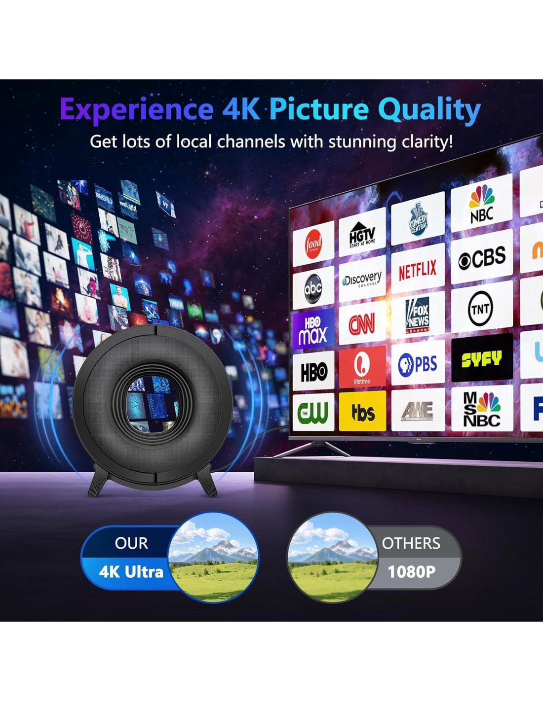 - Antena de TV 4K UHD gratuita: ¡Disfruta viendo TV 4K UHD sin costo! ¿Tienes problemas para pagar enormes facturas de cable para la TV? Nuestra antena Full HD para TV inteligente cuenta con el último chip IC inteligente para máxima amplificación de señal y prevención de interferencias. Accede a las principales cadenas como CBS, ABC, FOX, NBC, CW, PBS, ION, UNIVISION y más canales locales. Soporta 4K, 1080p y otros formatos digitales.