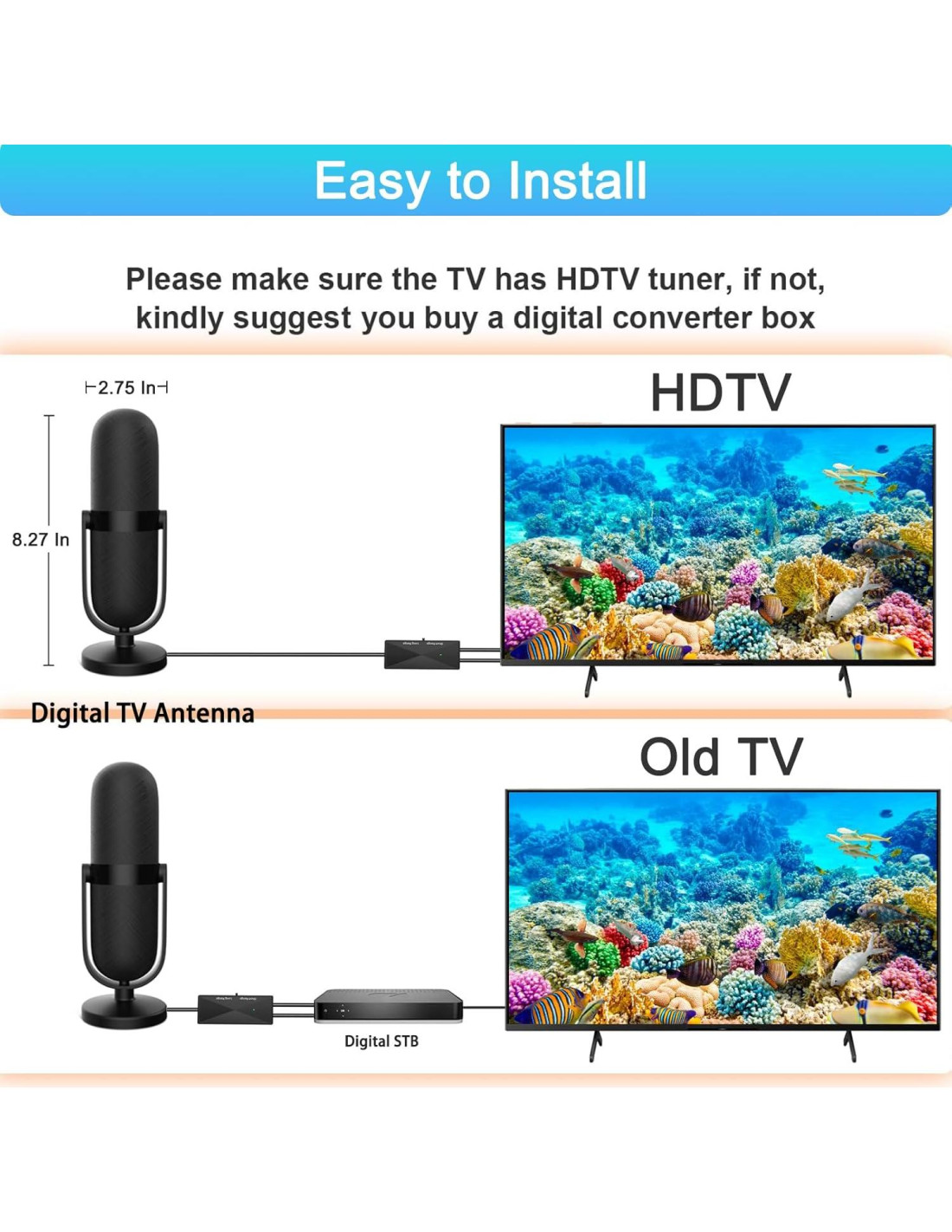 - Antena HD digital sin cable para canales de TV gratis, forma de micrófono, tamaño de solo 8.27in*2.75in (21.0 cm*7.0 cm), pero con chip IC inteligente incorporado, puede recibir 360 y señales FM, recibir transmisiones de TV, incluyendo 4K, UHD y 1080 HDTV, para obtener la mejor calidad de imagen y sonido