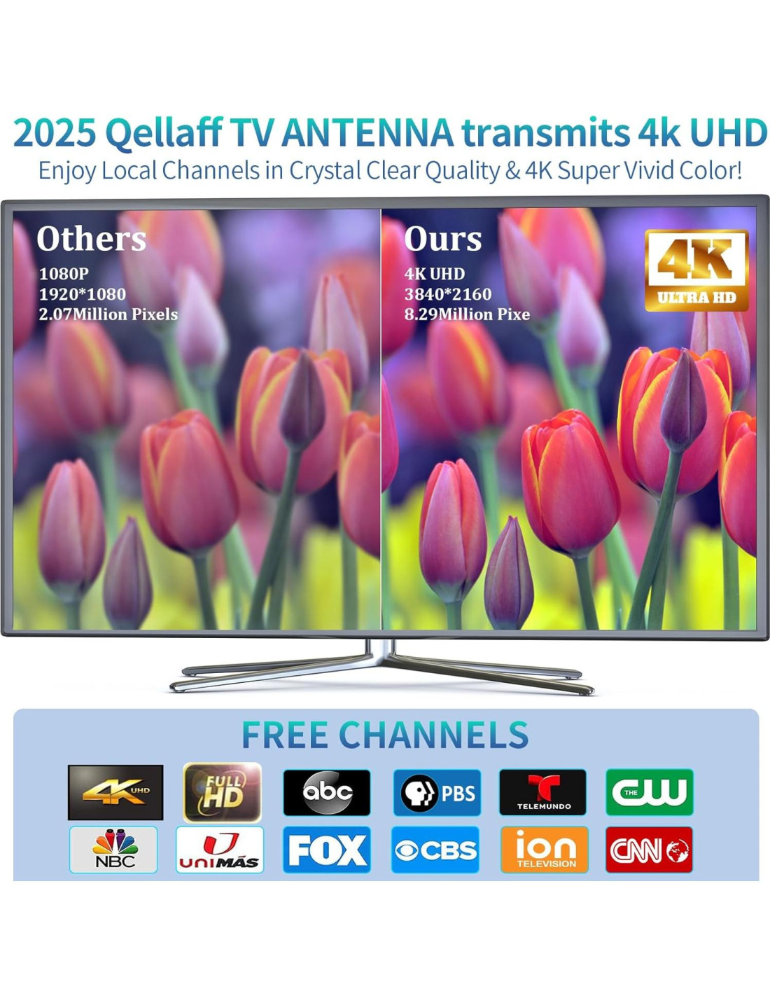 - Recepción de 360 para canales locales HDTV completos gratuitos - ¡Corta el cable y abraza la antena de TV Qellaff! Di adiós a las facturas mensuales para siempre. Nuestra antena de TV inteligente admite una variedad de formatos de señal, incluyendo 720p, 1080i, 1080p, 2K y 4K HDR. Disfruta de CANALES GRATUITOS como ABC, CBS, NBC, PBS, Fox, HBO, Univisión, HSN y muchos más. Con la antena digital amplificada de más de 2800 millas, accede a todas tus noticias, comedias, programas infantiles y deportes.