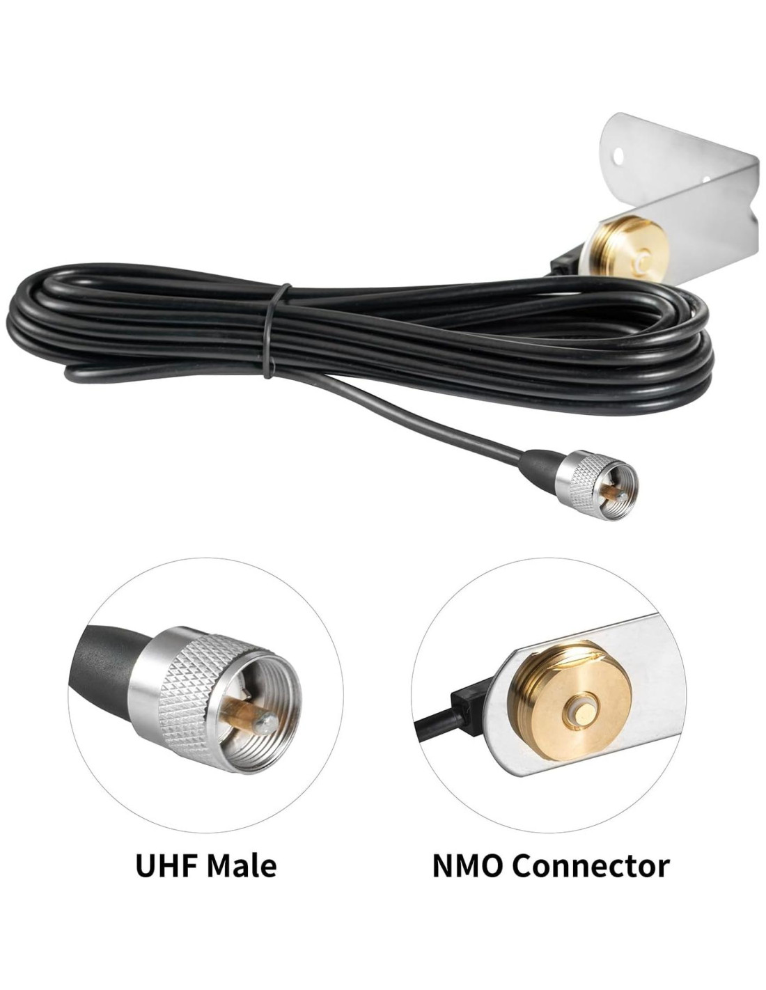 Frecuencia de la antena: 136-174/400-470Mhz; VSWR: Menos de 1.5; Potencia máxima de entrada - vatios: 100Watt; Ganancia: 2.15dBi; Longitud de la antena: 43.9 cm (17.3 pulgadas); Longitud del cable: 5 metros (16.5 pies) Cable RG58; Conector de extremo de cable: Conector macho UHF PL259; Conector de antena: NMO;
