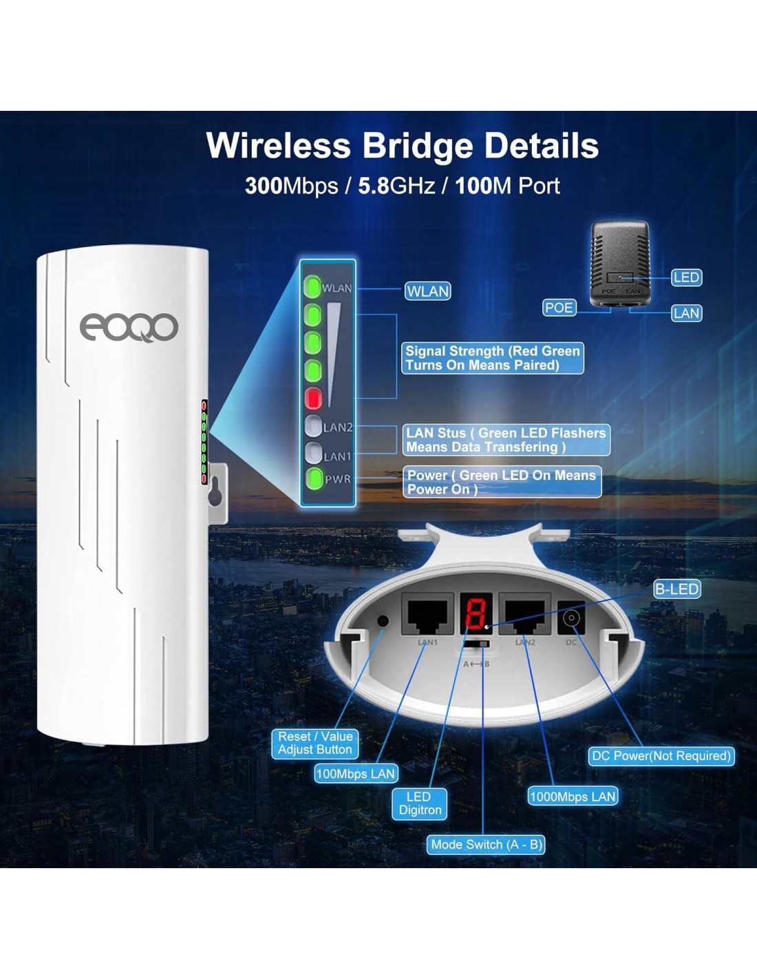 - Conexión Punto a Punto para Cobertura Inalámbrica: Puente wifi inalámbrico de modo múltiple con puerto ethernet y pantalla LED: Soporta modo de operación AP, Repetidor; Soporta servidor DHCP; Cobertura WiFi antes de 2 casas con 3KM de distancia. Transmite a través de WiFi inalámbrico, reduciendo la molestia del cableado.