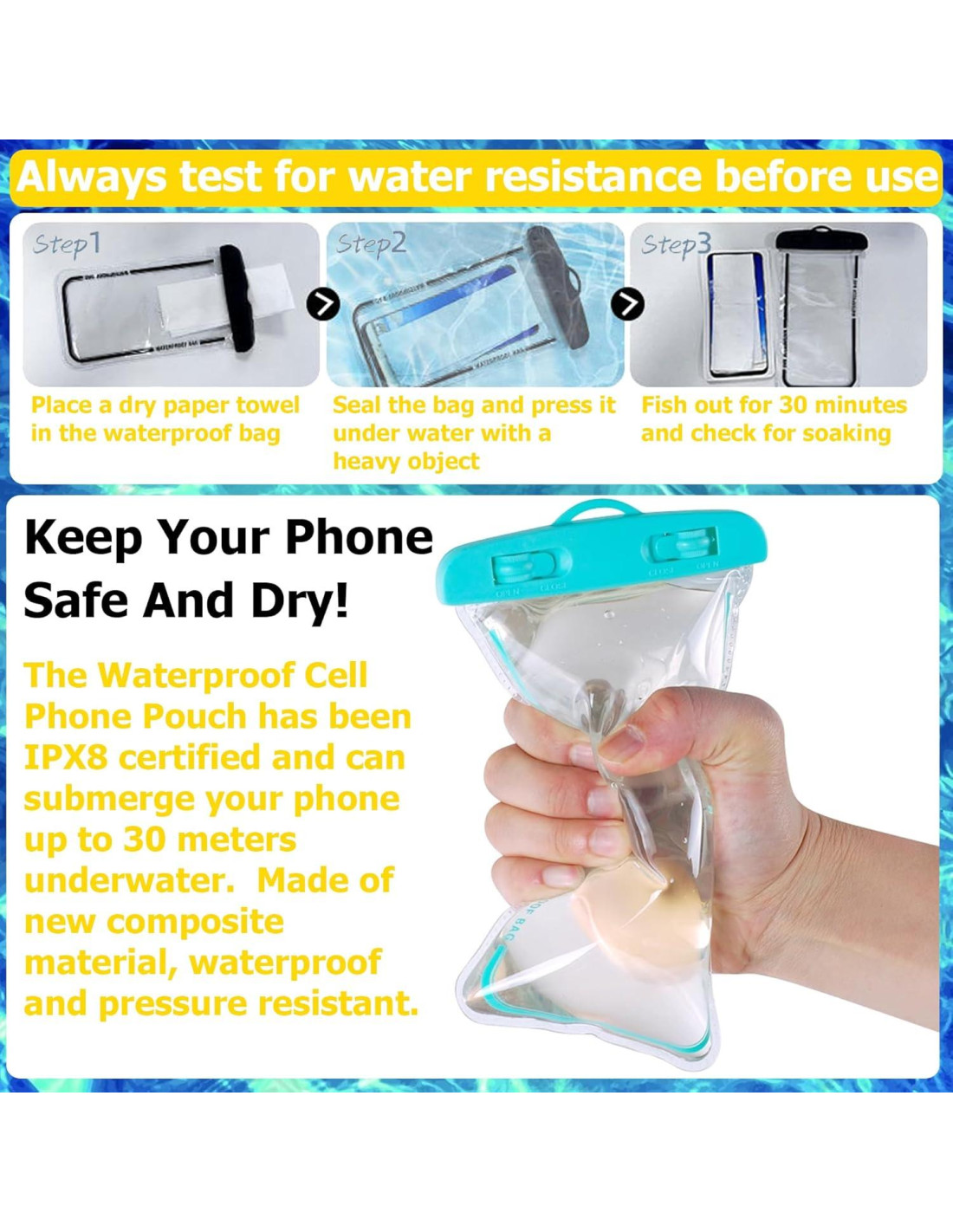 - ESENCIALES PARA PARQUES ACUÁTICOS: Nuestra funda de teléfono impermeable Consss está fabricada con nuevos materiales compuestos duraderos de alta definición. El diseño ultra delgado de 0.3mm asegura una excelente sensibilidad al tacto sin ningún retraso. La funda de teléfono impermeable también está certificada IPX8, permitiéndote sumergir tu teléfono hasta 30 metros bajo el agua. ¡Mantén tu teléfono seguro y seco!