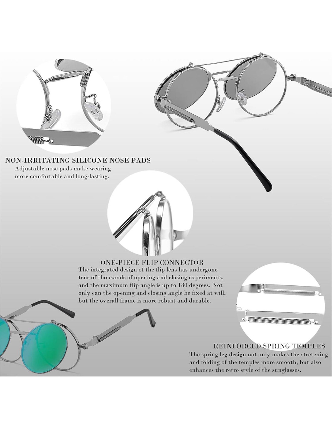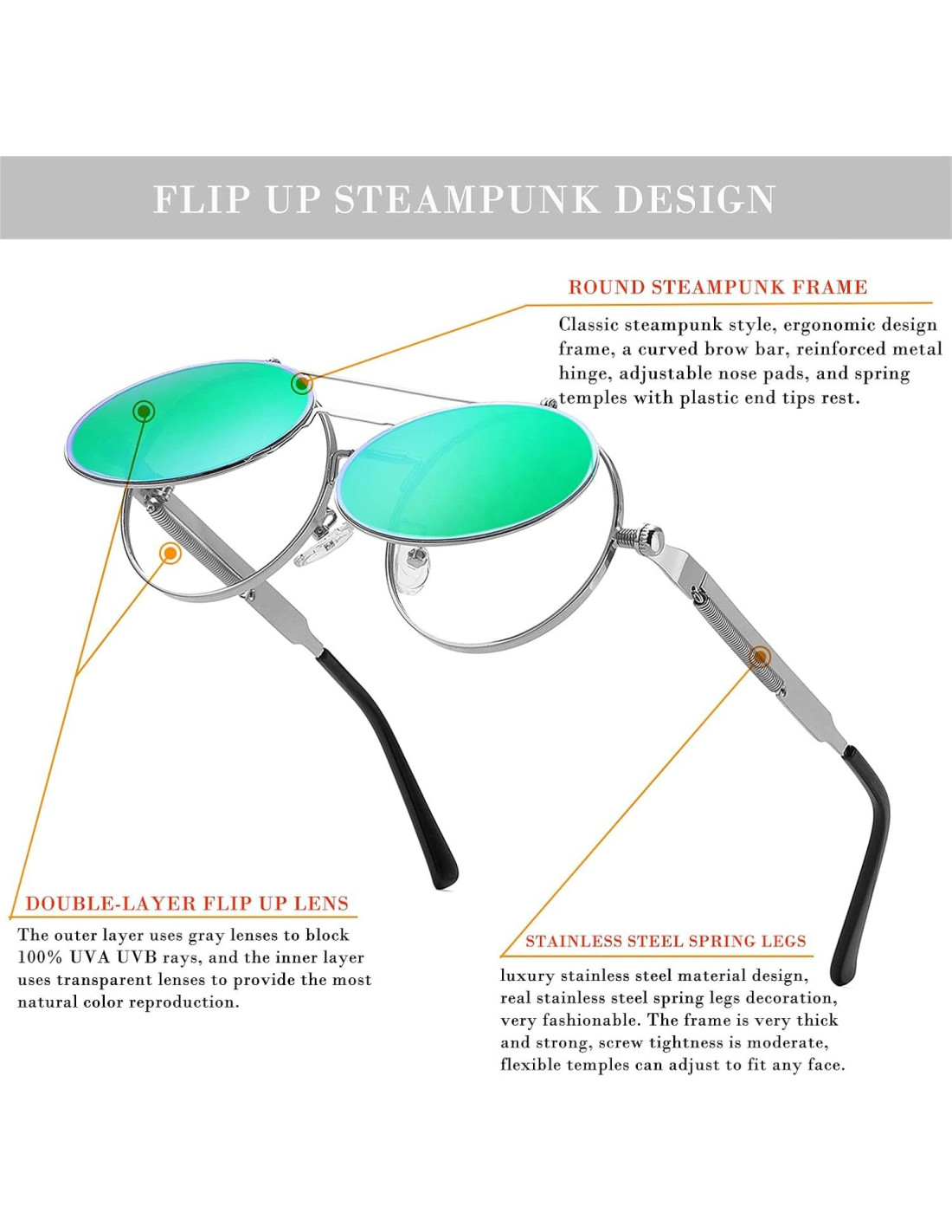 - ESTILO DIVERTIDO DE LENTES DOBLES CON TAPA: Como unas gafas de sol geniales, las gafas circulares con un diseño único de tapa levantada, pueden usarse tanto como gafas de sol como gafas transparentes. Las lentes de doble capa se pueden cambiar a voluntad según tu estado de ánimo en diferentes entornos.