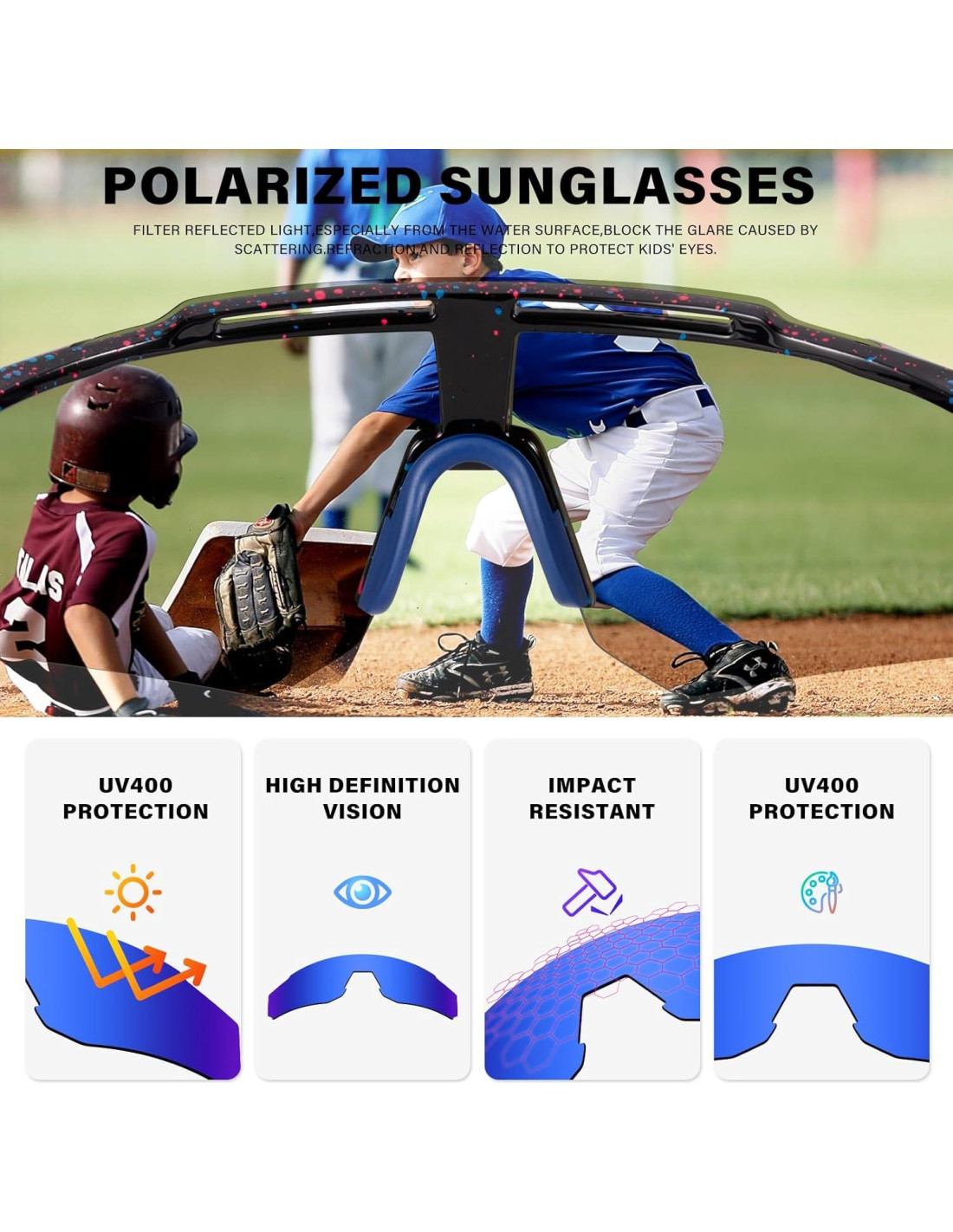 - Diseñadas para deportes, ya sea un día soleado en el campo de béisbol o una aventura en bicicleta con amigos, nuestras gafas de sol polarizadas para niños son el compañero perfecto para las escapadas al aire libre de su hijo. Así que, deje que sus hijos disfruten de sus deportes y actividades con confianza y estilo, sabiendo que sus ojos están protegidos con lo mejor.