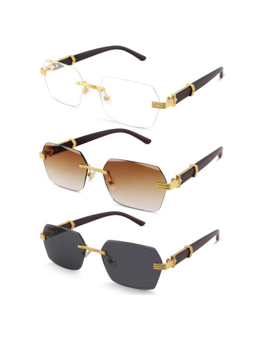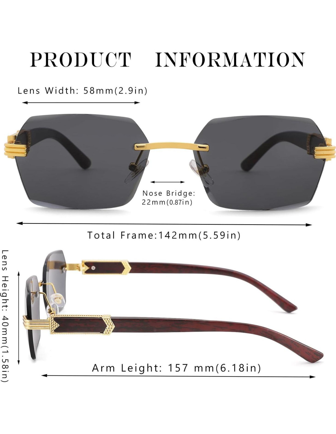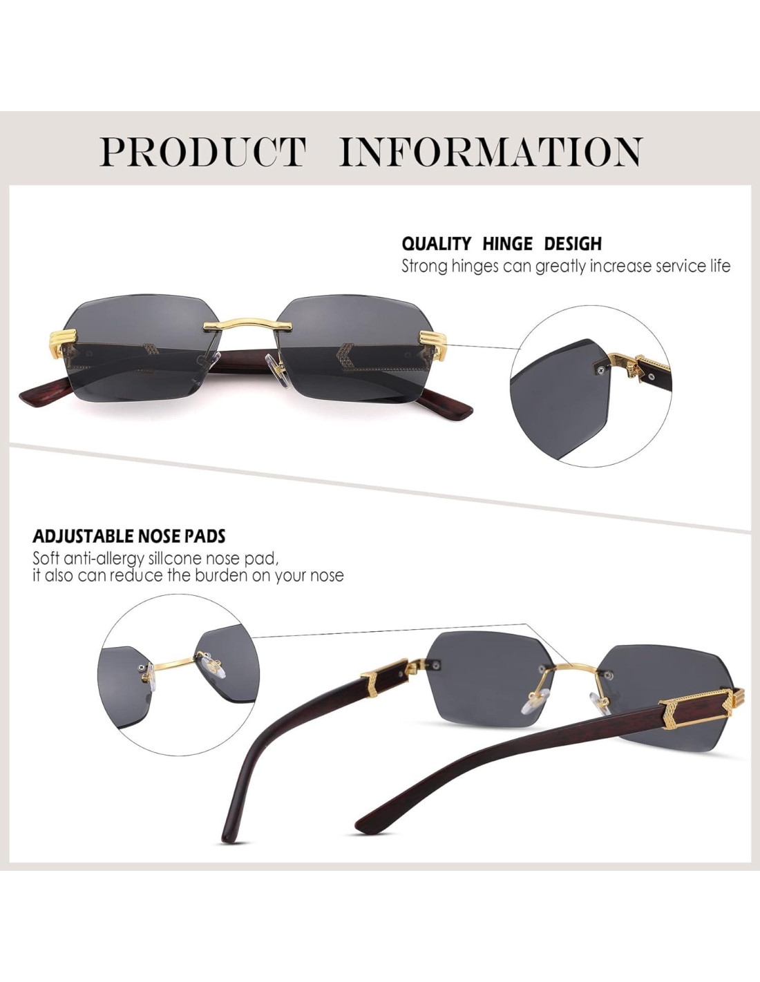 - DISEÑO ÚNICO: Las gafas de sol rectangulares sin montura Hycredi tienen el estilo de diseño más vanguardista, con montura muy ligera y patillas de imitación madera que te brindan una experiencia de uso sin estrés, las bisagras de metal reforzadas están diseñadas para evitar el aflojamiento de los tornillos, haciendo que las gafas sean más estables y se vean más modernas