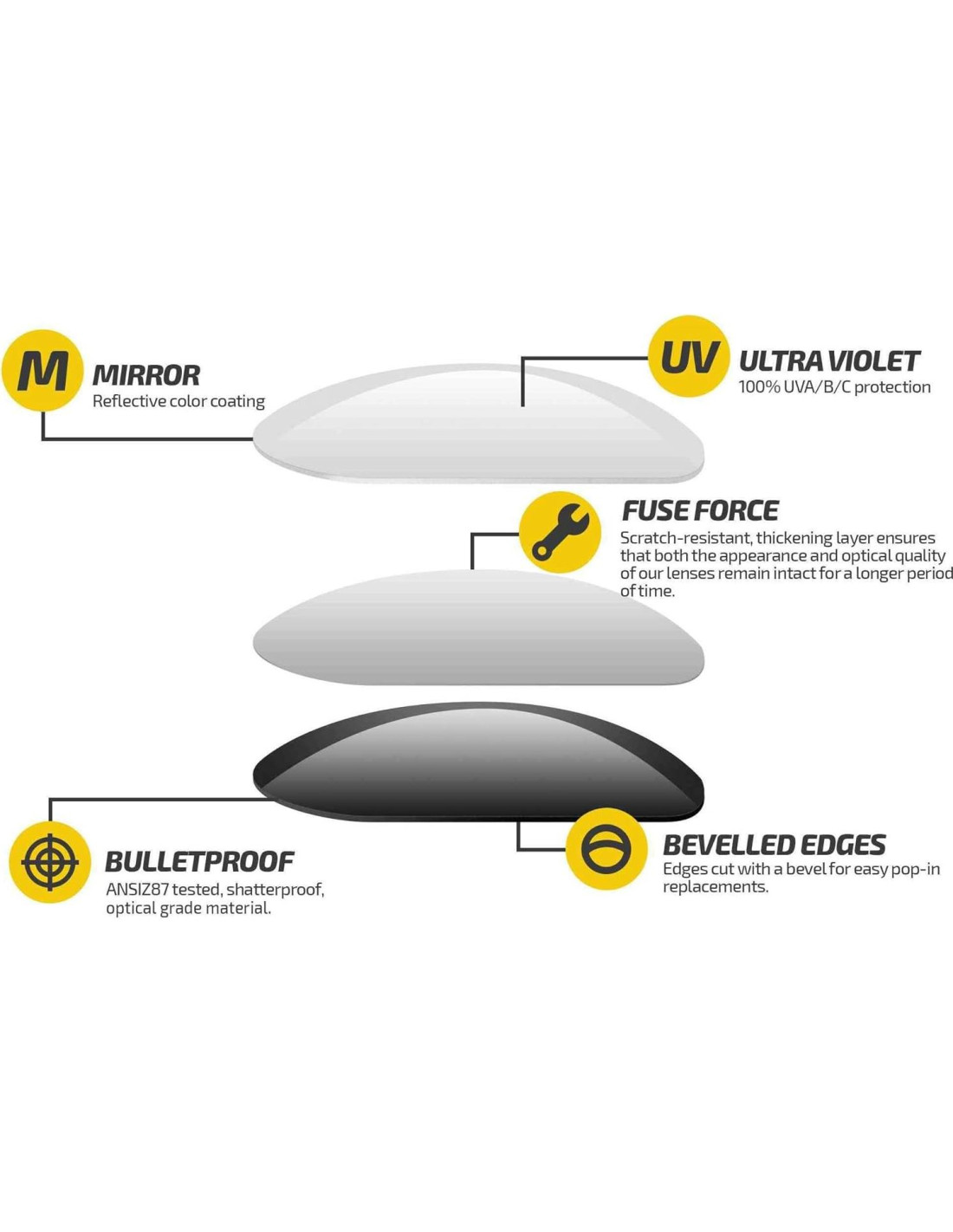 Aquí en Fuse Lenses, estamos dedicados a producir lentes de la más alta calidad al mejor precio posible para todos tus marcos de marca favorita. Cuando realizas un pedido con Fuse, nuestros técnicos de laboratorio óptico comienzan a cortar tus lentes a medida desde Clearwater soleado, FL, EE. UU. Puedes estar seguro de que tendrás algunos de los lentes más avanzados del mercado debido a nuestros estrictos estándares y nuestro amplio conocimiento de la industria óptica. Todas las compras incluyen una garantía de reemplazo de 1 año y 1 vez estándar, sin preguntas. Aún mejor, dado que la calidad de nuestros Lentes Fuse+ es mejor, pensamos que nuestra garantía debería coincidir. Los lentes Fuse+ vienen con una garantía de reemplazo de por vida, 1 vez. ¿Protección UV al 100%? Verificado. ¿Claridad óptica cristalina? Verificado. ¿Resistencia al impacto que supera los estándares ANSI Z87? Verificado. ¿Opciones de lentes y colores para todas tus gafas de marca favorita? Verificado y verificado. Recupera tu vista con los lentes de reemplazo personalizados de Fuse Lenses. Puedes darle fácilmente a cualquier par de gafas de sol un aspecto renovado y actualizado con nuestros lentes intercambiables. Obtén la visión que mereces en los colores que anhelas con cualquiera de nuestras más de 50 opciones de color disponibles en material óptico de calidad. ¡Ve la diferencia por ti mismo! Mejora tus gafas de sol hoy con un par de Lentes Fuse. Es tan fácil como poner, salir. El logo e imágenes de Fuse Lenses son propiedad de EyeCandy Eyewear, LLC. Fuse Lenses no está asociado con ninguna otra marca. Todos los lentes de reemplazo son hechos a medida por encargo y no son productos del fabricante original (OEM) y no contendrán logos o marcas de OEM en los lentes. ADVERTENCIA: Este producto contiene químicos que el Estado de California sabe que causan cáncer y defectos de nacimiento u otro daño reproductivo.
