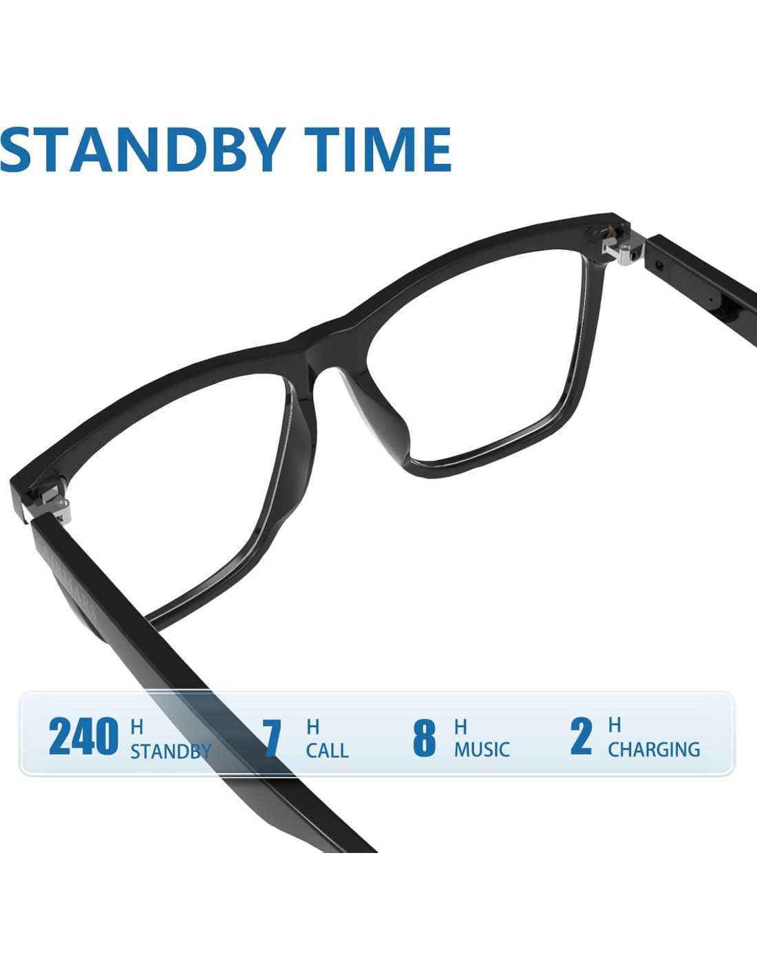 - Nuestras gafas de sol inteligentes Bluetooth están alimentadas por baterías de alta capacidad, disfruta de hasta 7 horas de tiempo de conversación y 8 horas de reproducción de música con una sola carga, la batería incorporada de 160mah/3.7V solo tarda 2 horas en cargarse completamente y puede soportar 240 horas de tiempo en espera, estas gafas de sol Bluetooth están diseñadas para un uso durante todo el día.