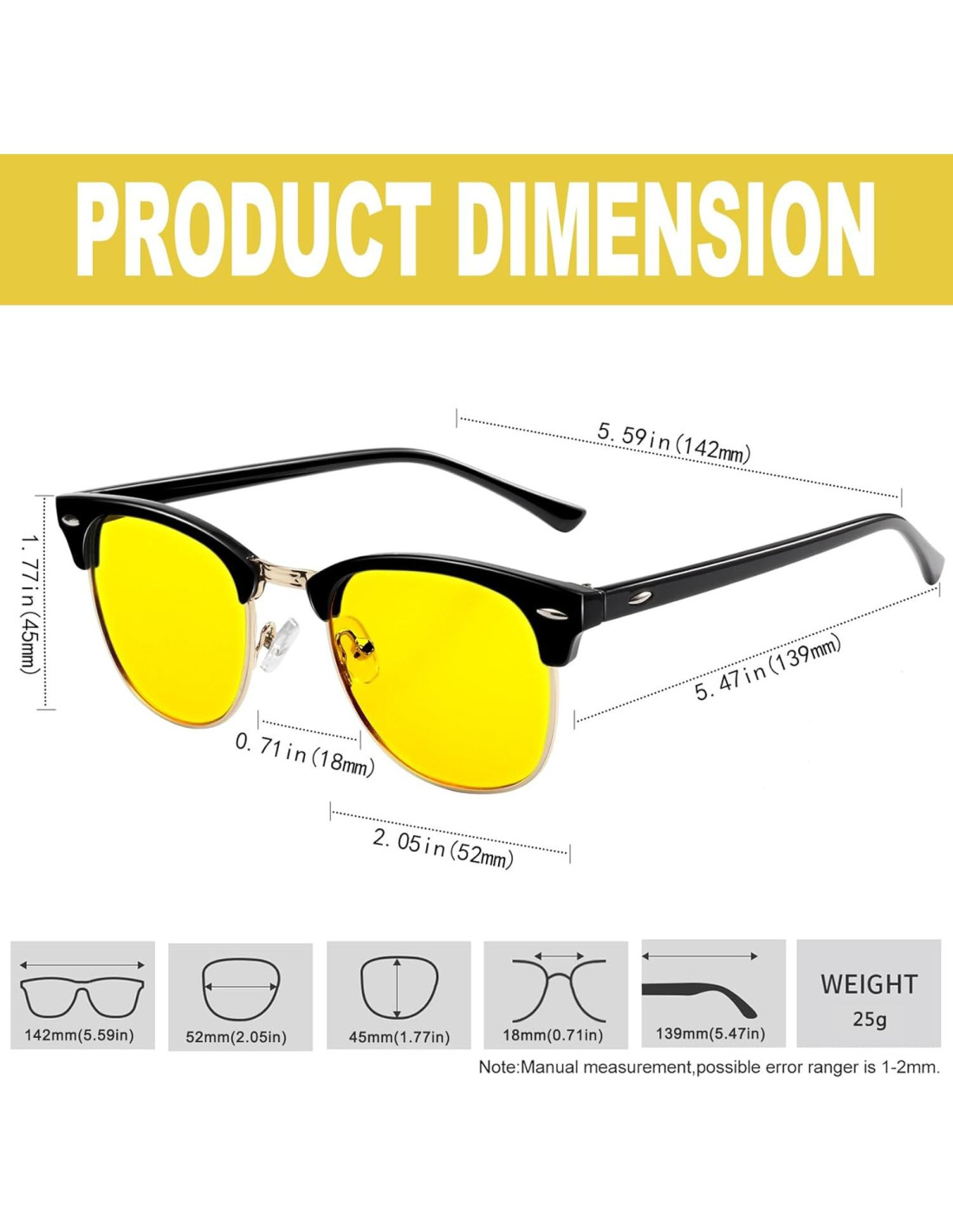 - Gafas para conducir de noche: Las lentes amarillas pueden reducir eficazmente el deslumbramiento causado por luces fuertes, mejorar el contraste, aumentar la claridad de la visión nocturna, aliviar la fatiga ocular y aumentar el factor de seguridad al conducir de noche. Te hacen sentir seguro al conducir o hacer ejercicio de noche o en días nublados, con niebla o lluviosos