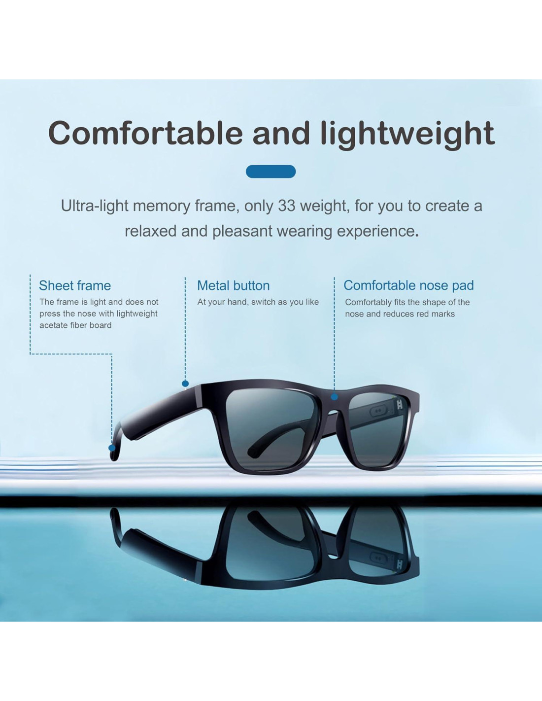 - [ Asistente de Voz ] Las Gafas Inteligentes tienen Tecnología de Asistente de Voz Inteligente, con los botones en tus gafas, puedes responder llamadas fácilmente, reproducir/pausar música, saltar pistas, ajustar el volumen y activar el Asistente de Voz