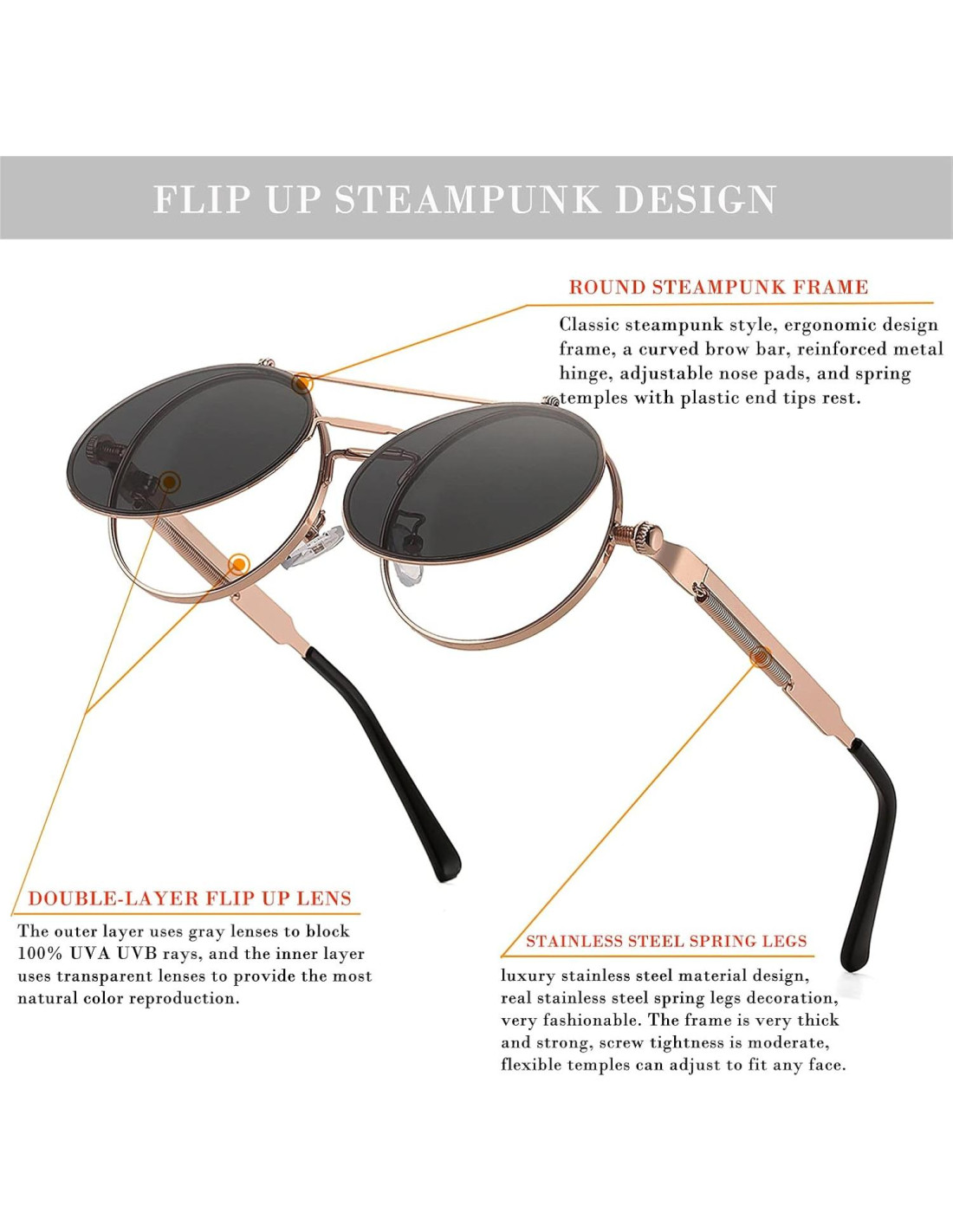 - MONTURA METÁLICA STEAMPUNK Estas gafas hippies están hechas de acero inoxidable ultra puro con un recubrimiento antioxidante que no se corroe ni se desvanece con el uso diario. Las patas reforzadas con resorte permiten una apertura y cierre suaves de las patillas. Reposacabezas de silicona ajustable y amigable con la piel, todos estos detalles aseguran tu comodidad al usar las gafas flip up durante largos períodos de tiempo.