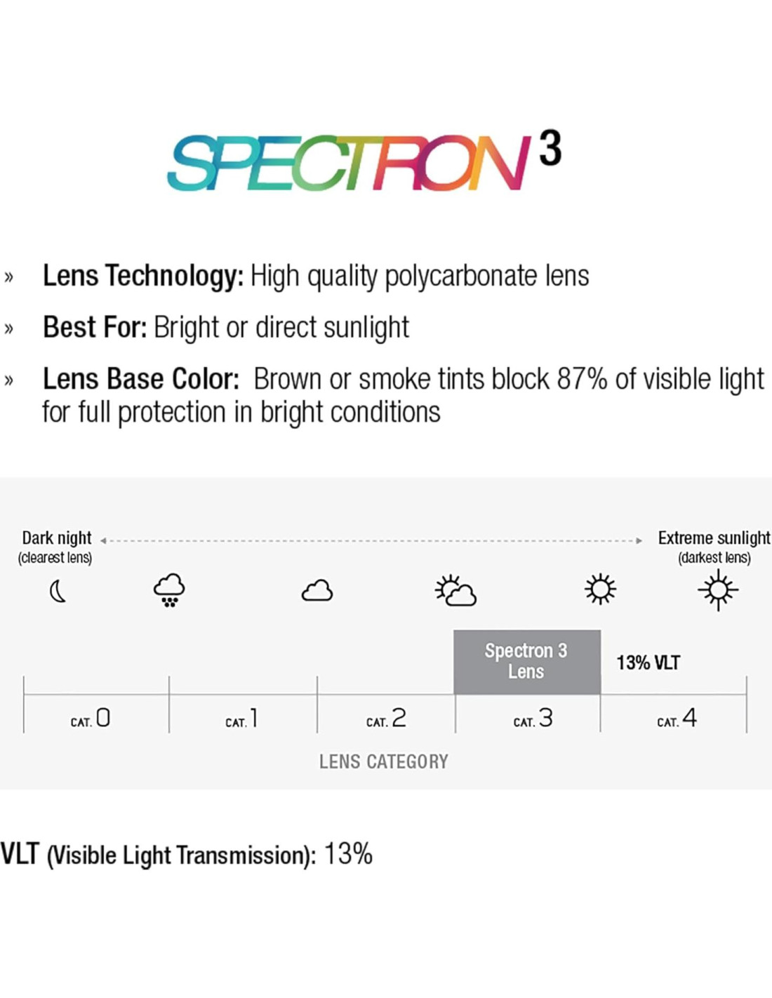 - LENTE SPECTRON 3: Lente de policarbonato ideal para condiciones de parcialmente nublado a soleado. Ofrece un 13% de Transmisión de Luz Visible (VLT), bloqueando el 87% de la luz. Protección del 100% contra UVA, B y C. Acabado espejo Color Flash (CF) mejora la filtración de luz visible.