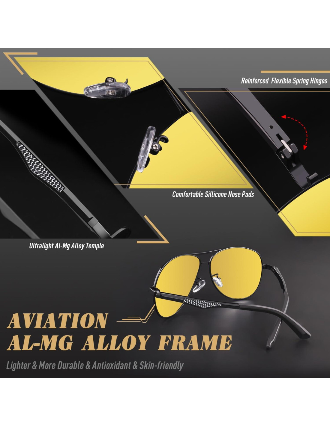- LENTE AMARILLA POLARIZADA Y ANTI-REFLEJO. Las gafas de conducción nocturna CGID con lente amarilla polarizada anti-reflejo pueden bloquear el deslumbramiento agudo de los faros, luces de calle y tráfico para una visión ultra clara, mientras mejoran y aclaran su área visual y mejoran su conducción a un nivel más seguro.