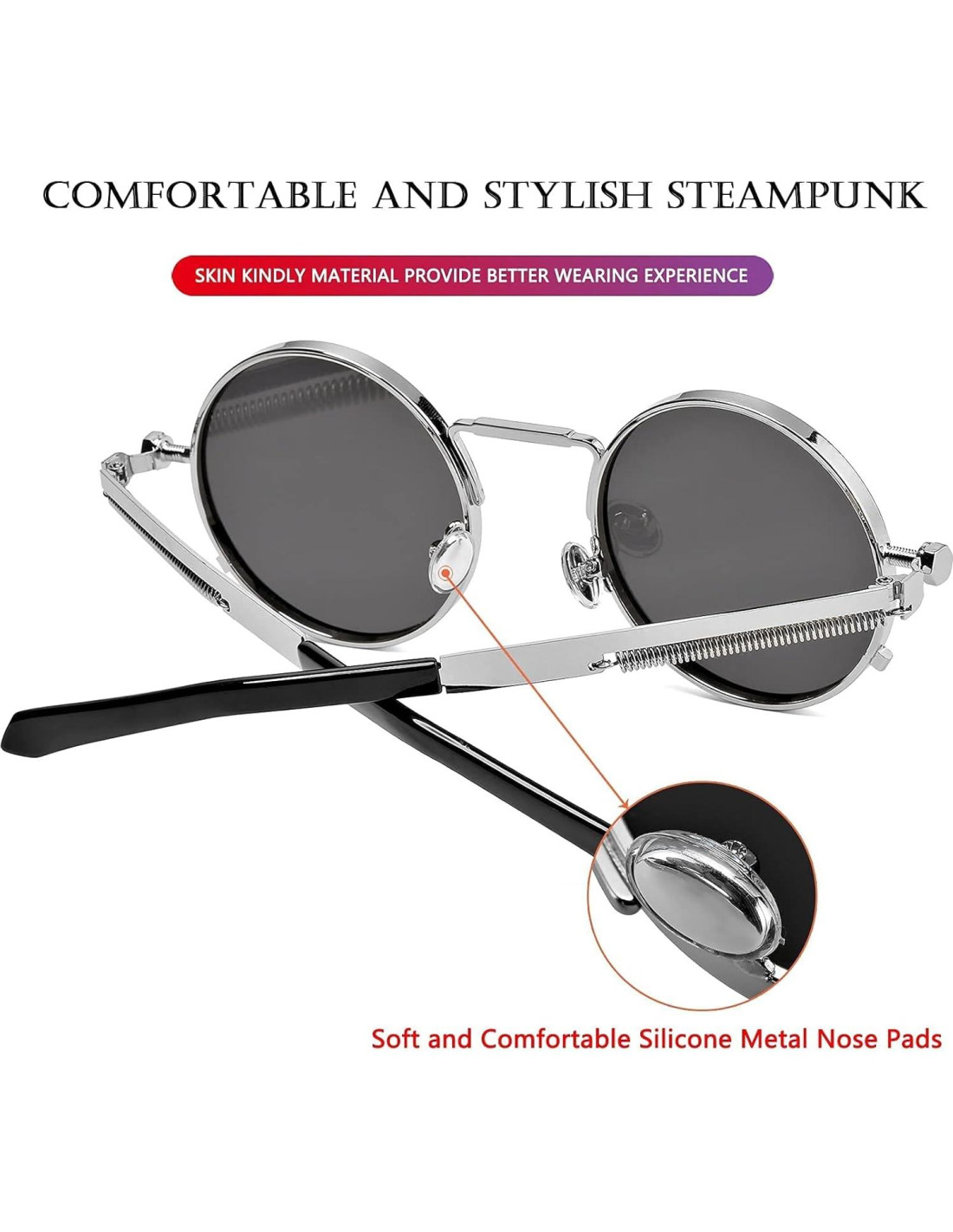 - MARCO REDONDO RETRO PEQUEÑO - Diseño ergonómico del marco, una barra de cejas curvada, bisagra de metal reforzada, almohadillas nasales ajustables y materiales amigables con la piel, templos de resorte, el diseño clásico hace que estas gafas de sol steampunk para hombres y mujeres sean más cómodas y duraderas mientras las usas